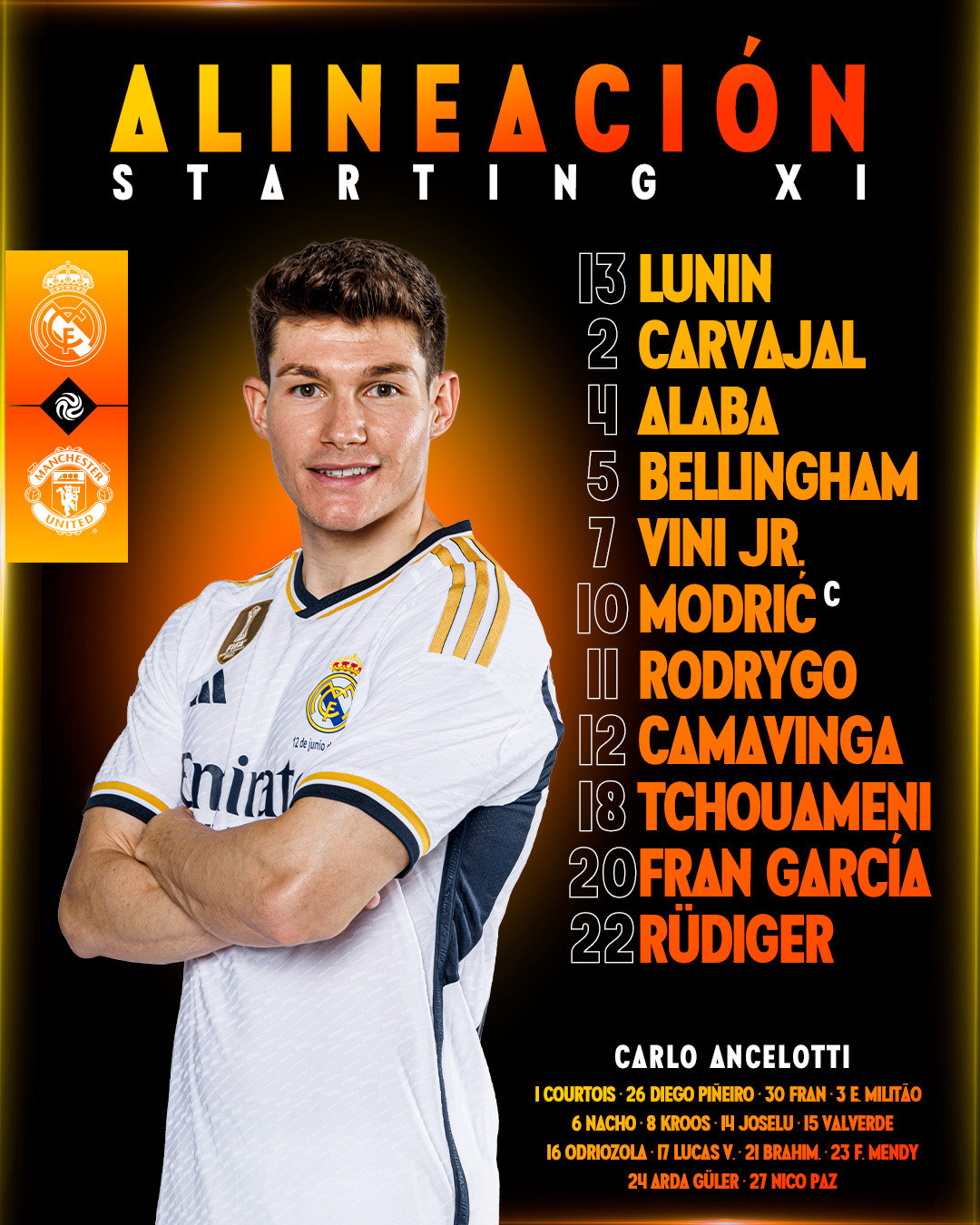 Real Madrid: Lunin, Carvajal, Alaba, Rudiger, Garcia, Bellingham, Modric, Tchouameni, Camavinga, Rodrygo, Vinicius.