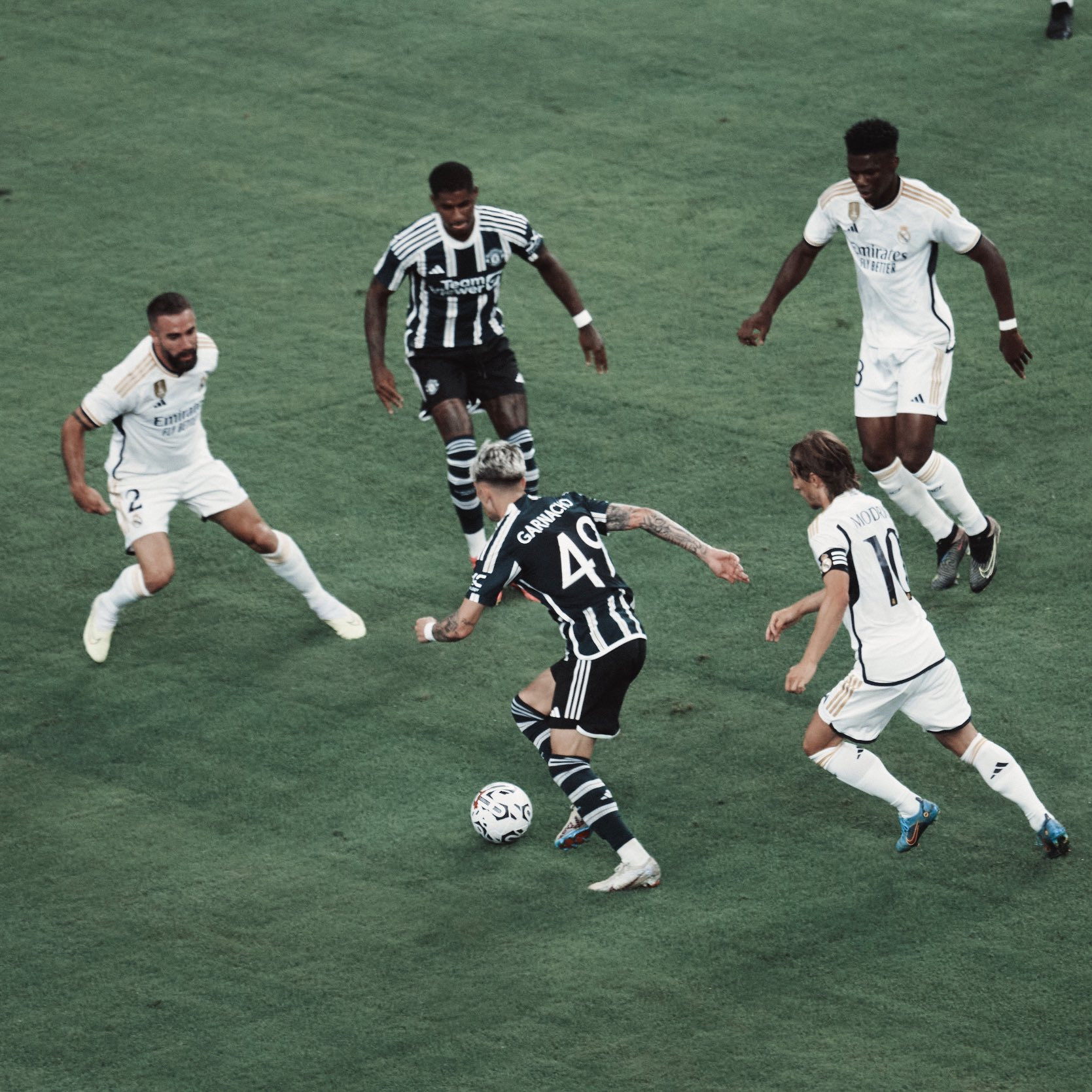 Jude Bellingham vừa có pha solo táo bạo trước vòng cấm MU nhưng không vượt qua được rừng hậu vệ đối phương.