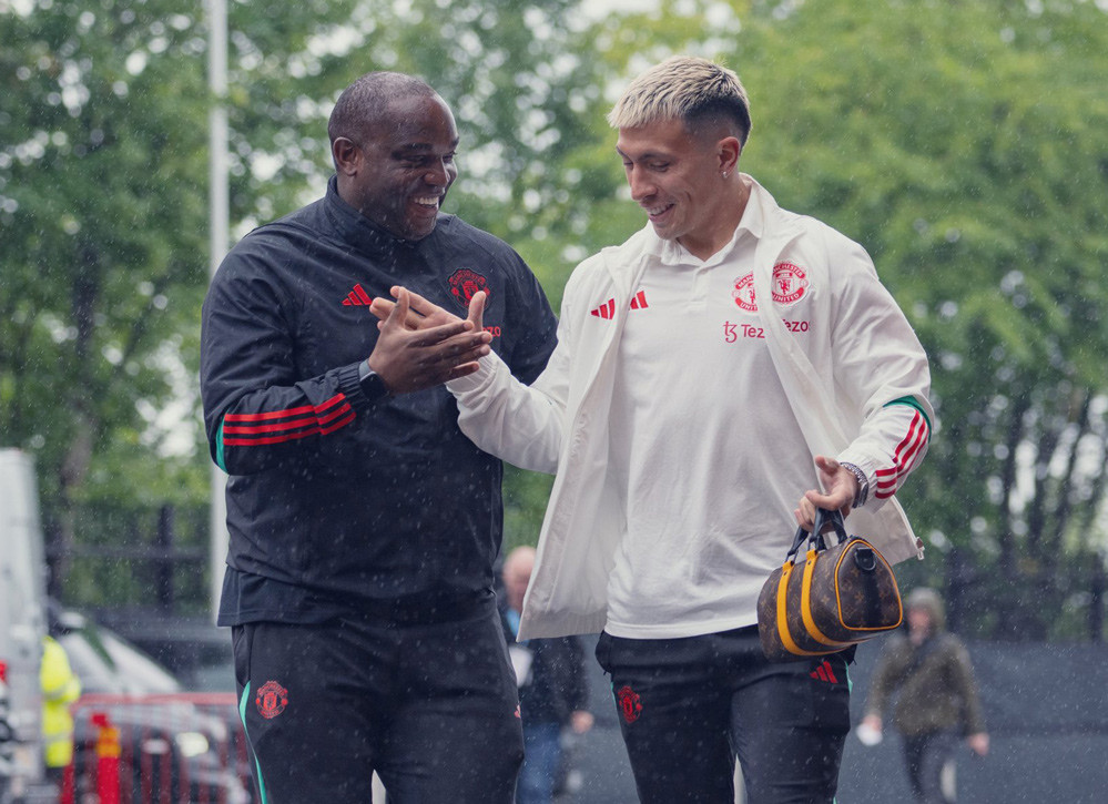 Lisandro Martinez nhận thẻ vàng đầu tiên của trận đấu sau tình huống phạm lỗi nguy hiểm với Pedro Neto.