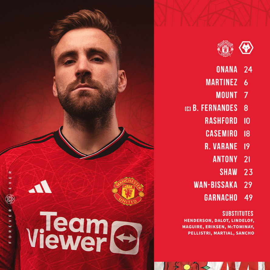 MU: Onana; Wan-Bissaka, Varane, Martinez (Lindelof 46'), Shaw; Casemiro, Fernandes, Mount (Eriksen 68'), Antony (Pellistri 77'), Garnacho (Sancho 68'), Rashford (McTominay 87').