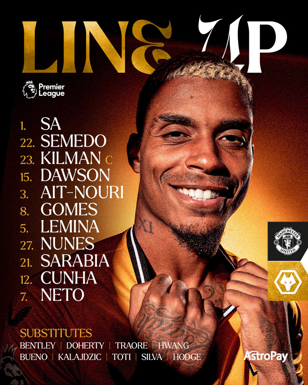 Wolves: Jose Sa; Semedo, Kilman, Dawson, Ait-Nouri (Bueno 78'); Nunes, Lemina, Gomes; Sarabia (Hwang 62'), Cunha (Fabio Silva 77'), Neto.