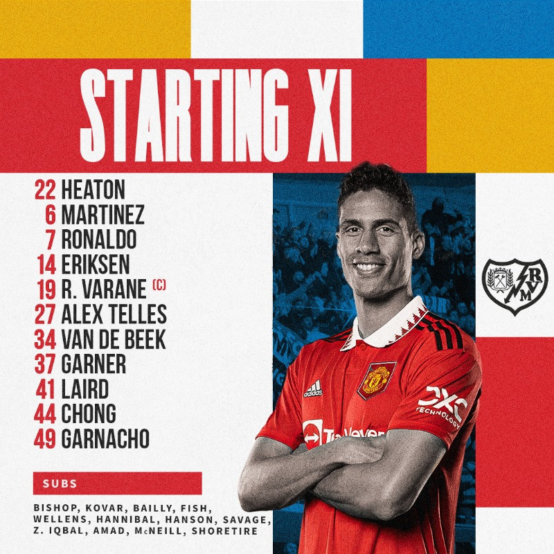 MU: Heaton; Laird, Varane, Martinez, Telles; Garner, Van de Beek, Eriksen; Chong, Garnacho, Ronaldo.