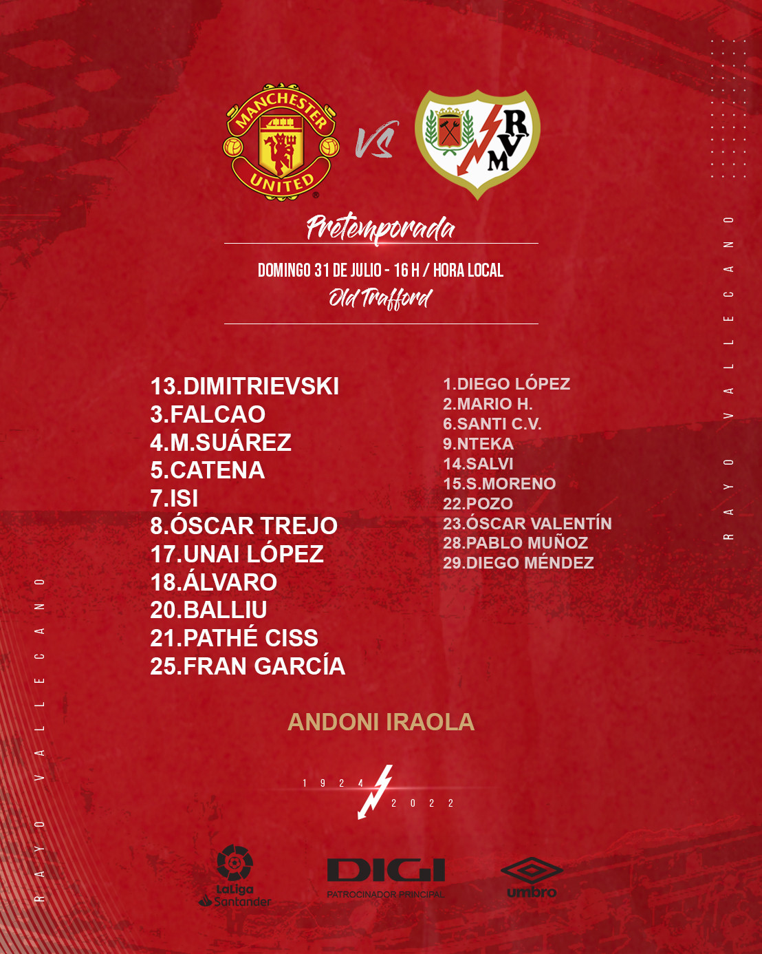 Rayo Vallecano: Dimitrevski; Garcia, Suarez, Balliu, Catena, Isi, Lopez, Alvaro, Ciss, Trejo, Falcao.
