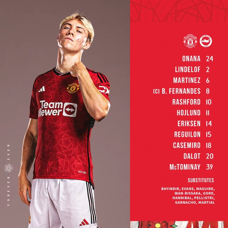 MU: Onana; Reguilon, Lindelof, Martinez, Dalot; Casemiro, Eriksen; McTominay, Fernandes, Rashford; Hojlund.