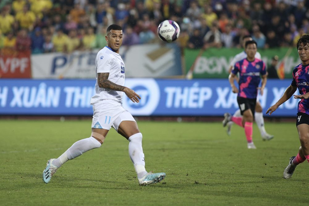 BÀN THẮNG! Nam Định 3-0 Sài Gòn (Rodrigo): Hàng phòng ngự của Sài Gòn chơi như mơ ngủ để Rodrigo thoải mái dứt điểm căng nâng tỉ số lên 3-0.