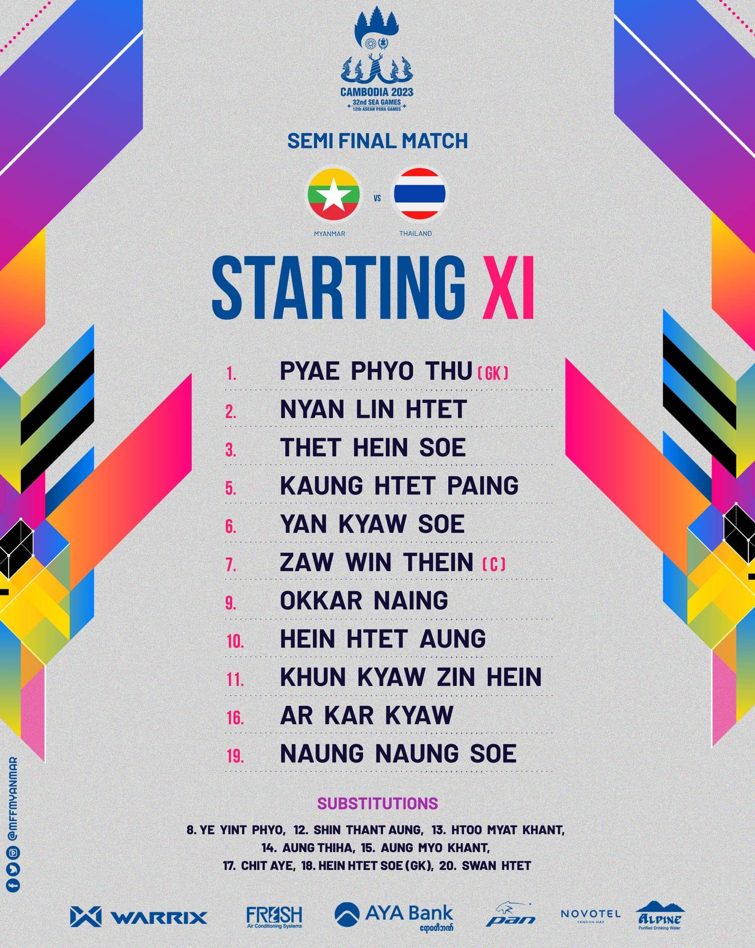 U22 Myanmar: Pyae Phyo Thu, Nyan Lin Htet, Thet Hein Soe, Kaung Htet Paing, Yan Kyaw Soe, Zaw Win Thein, Okkar Naing, Hein Htet Aung, Khun Kyaw Zin Hein, Ar Kar Kyaw, Naung Naung Soe.