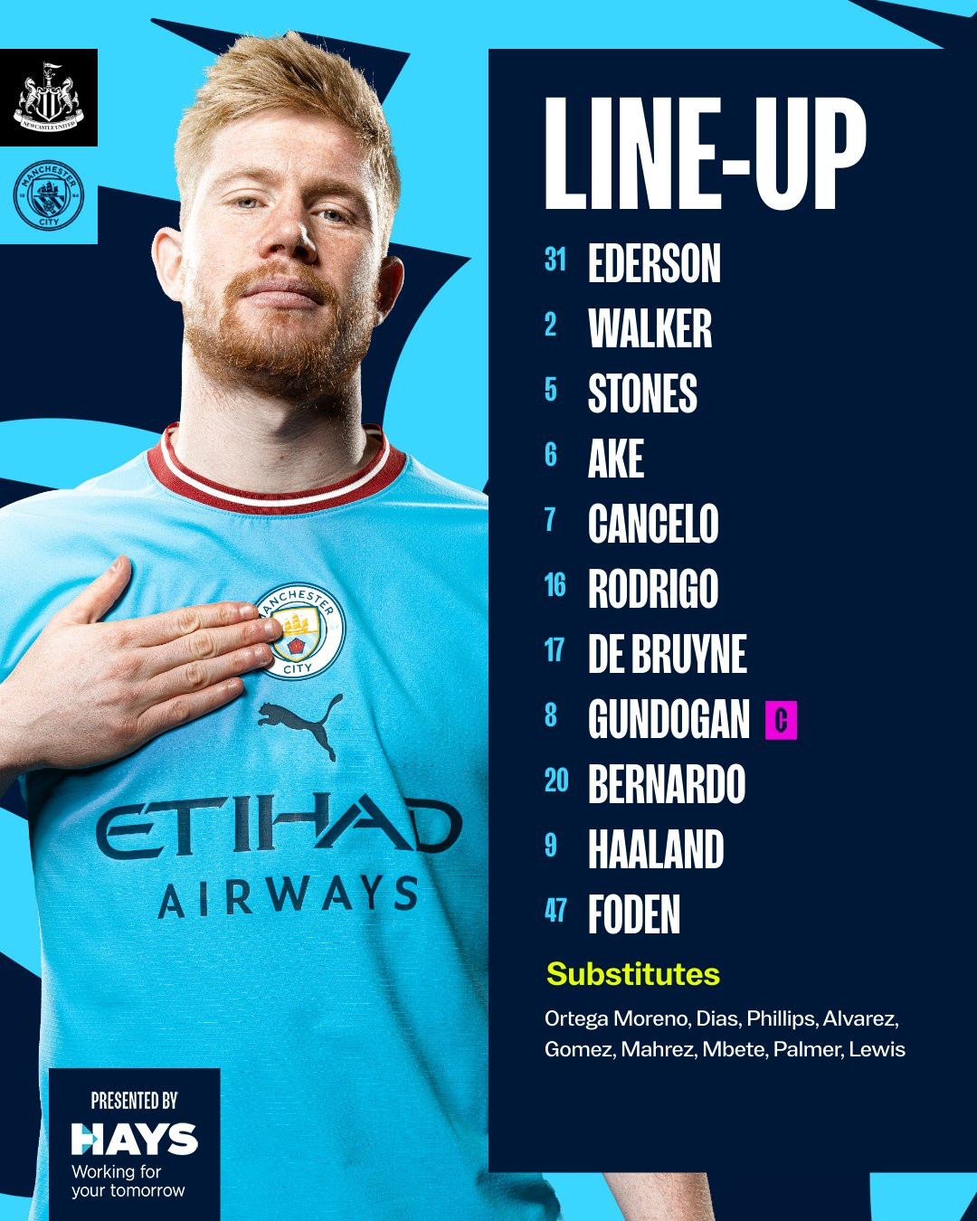 Man City (4-3-3): Ederson; Walker, Stones, Ake, Cancelo; De Bruyne, Rodri, Gundogan; Bernardo, Haaland, Foden.