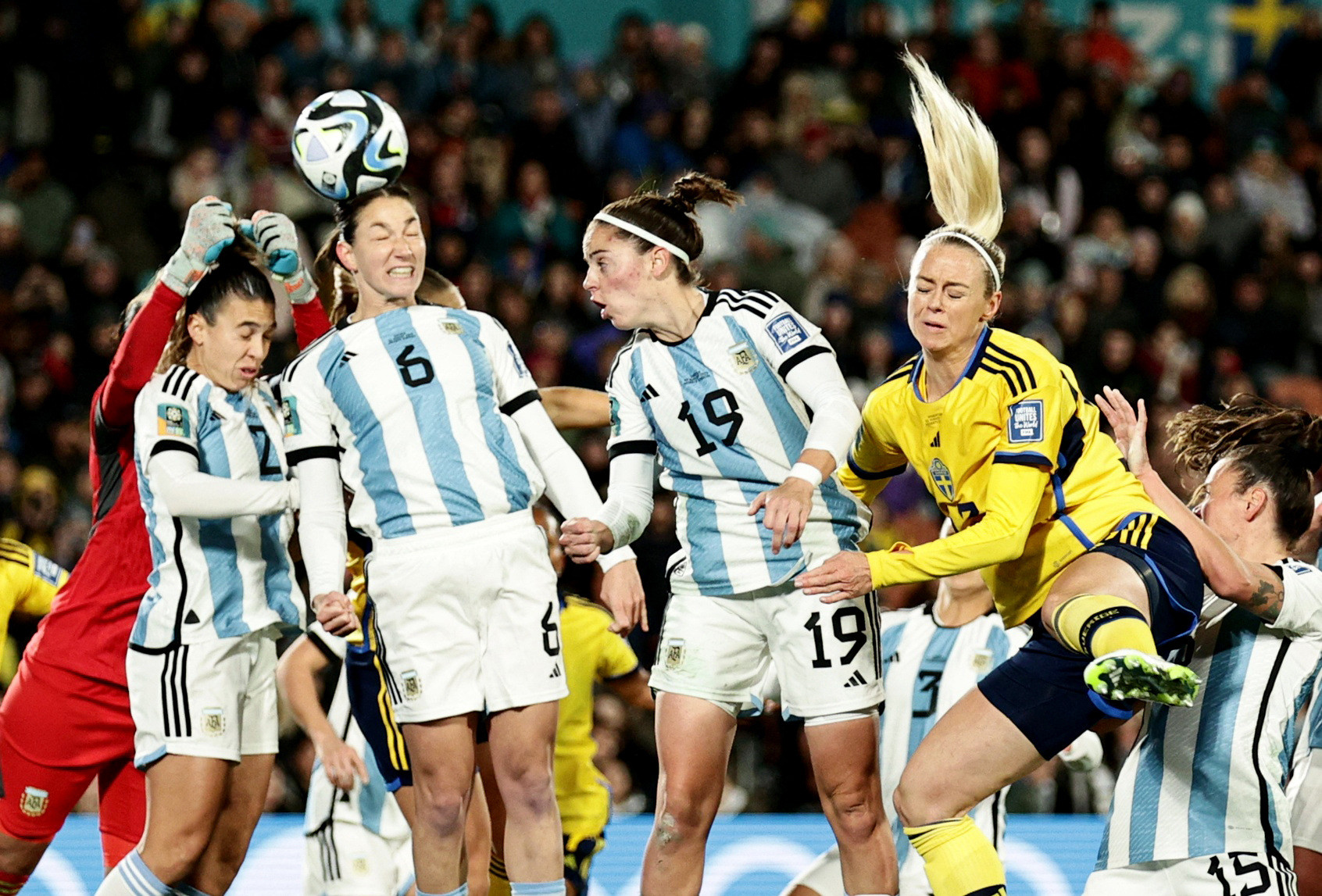 Khung thành nữ Argentina chao đảo khi Thụy Điển được hưởng 3 quả phạt góc liên tiếp.