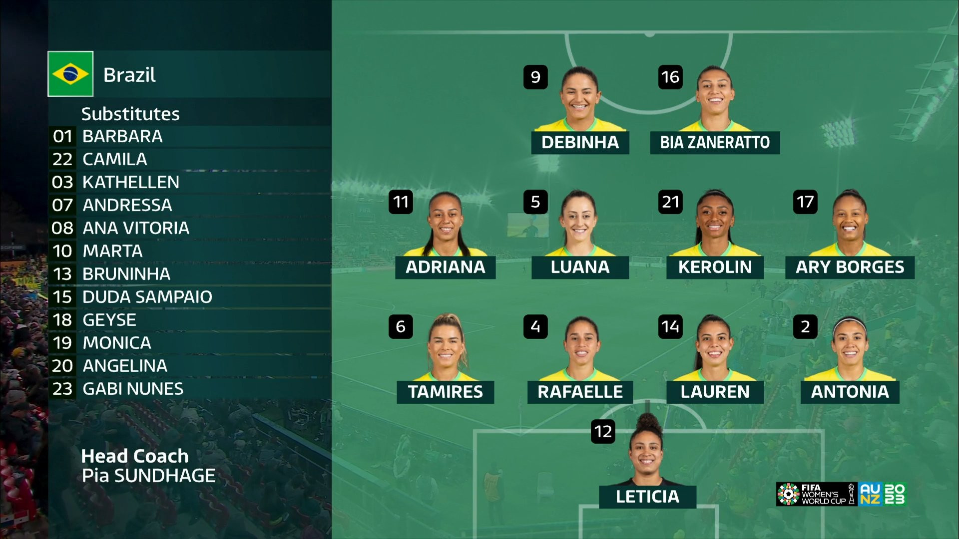 ĐT nữ Brazil (4-3-1-2): Leitica; Antonia, Rafaelle, Tamires, Lauren; Borges, Kerolin, Luana; Adriana; Debinha, Zaneratto.