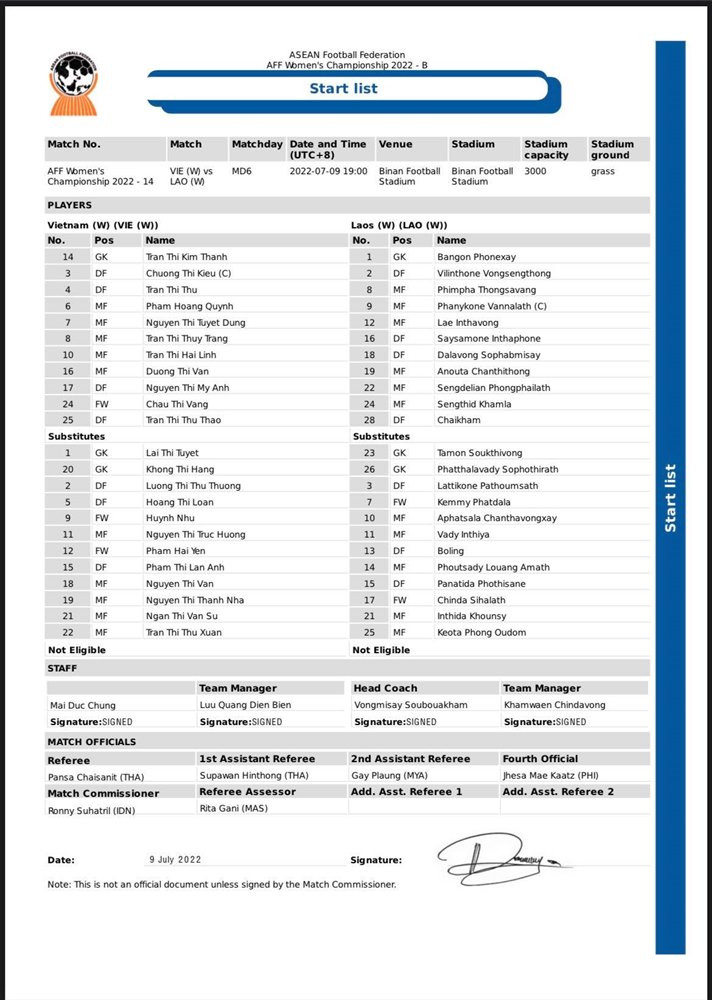 Nữ Lào: Bangon Phonexay, Vilinthone Vongsengthong, Phimpha Thongsavang, Phanykone Vannalath, Saysamone Inthaphon, Dalavong Sophabmisay, Aphatsala Chanthavongxay, Anouta Chanthithong, Sengdelian Phongphailath, Sengthid Khamla, Chaikham