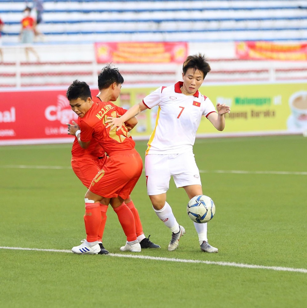Xuất phát từ pha phản công nhanh, Huỳnh Như mở biên cho Thùy Trang băng lên dứt điểm buộc thủ môn May Zin Nwe cản phá. Hai hậu vệ áo đỏ lúng túng cản phá tạo cơ hội để đội trưởng ĐT nữ Việt Nam dứt điểm gỡ hòa 1-1.