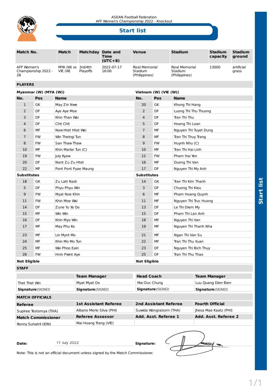 Nữ Việt Nam: Khổng Thị Hằng (Kim Thanh 63'), Thu Thương (Chương Thị Kiều 63'), Trần Thị Thu, Mỹ Anh (Bích Thùy 46'), Hoàng Thị Loan ( Ngân Thị Vạn Sự 90'+3), Thùy Trang (Thanh Nhã 73'), Hải Linh, Dương Thị Vân, Tuyết Dung, Huỳnh Như, Hải Yến.