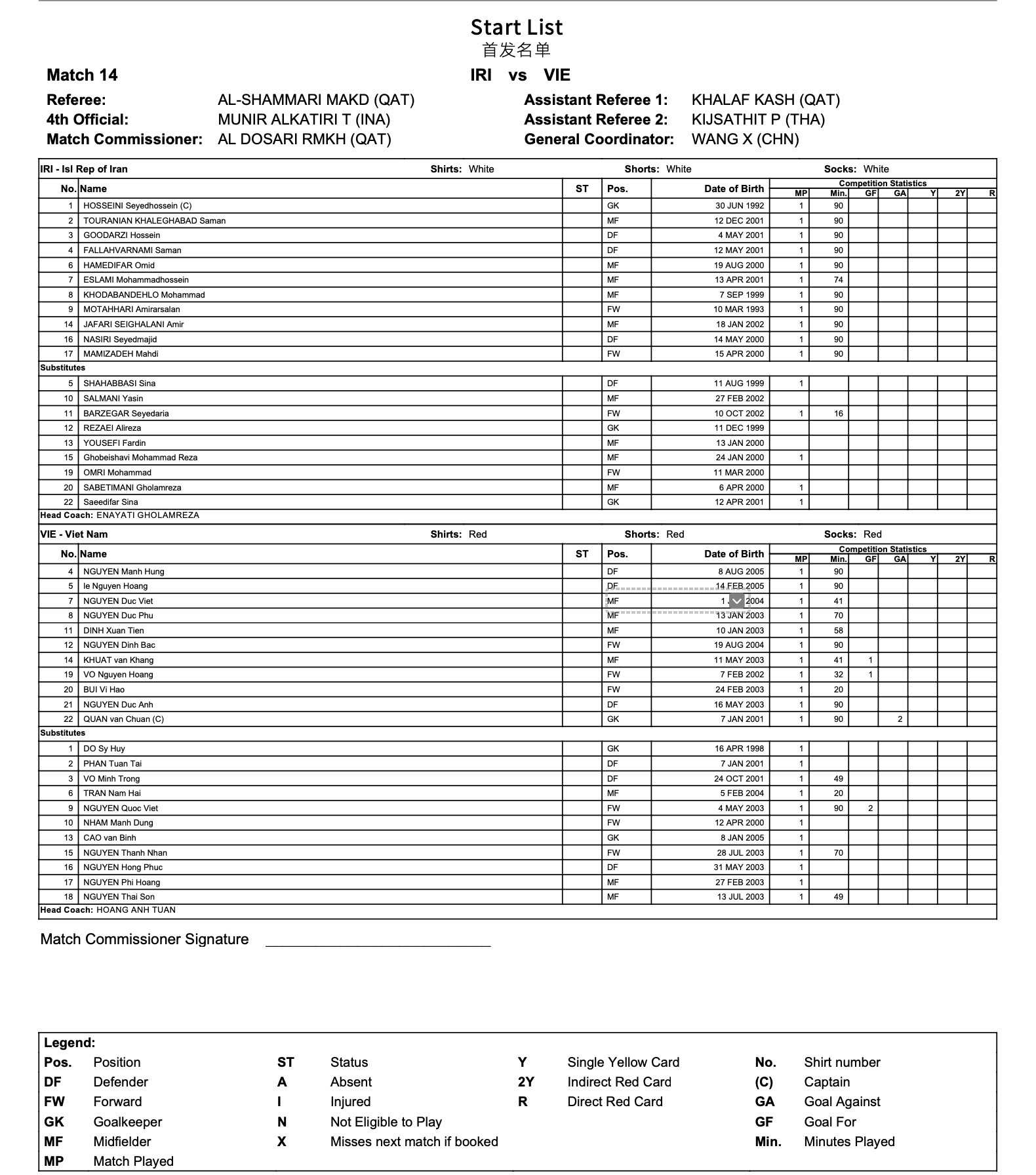 Olympic Iran: Hosseini, Eslami, Fallah (Shahabbasi, 61’), Goudarzi (và Ghobeshavi, 61’), Jafari, Khodabandeh (Sabetimani, 83'), Hamedifar, Mamizadeh (Rezaei, 72’), Motahhari (Berzegar, 72'), Nasiri, Touranian.