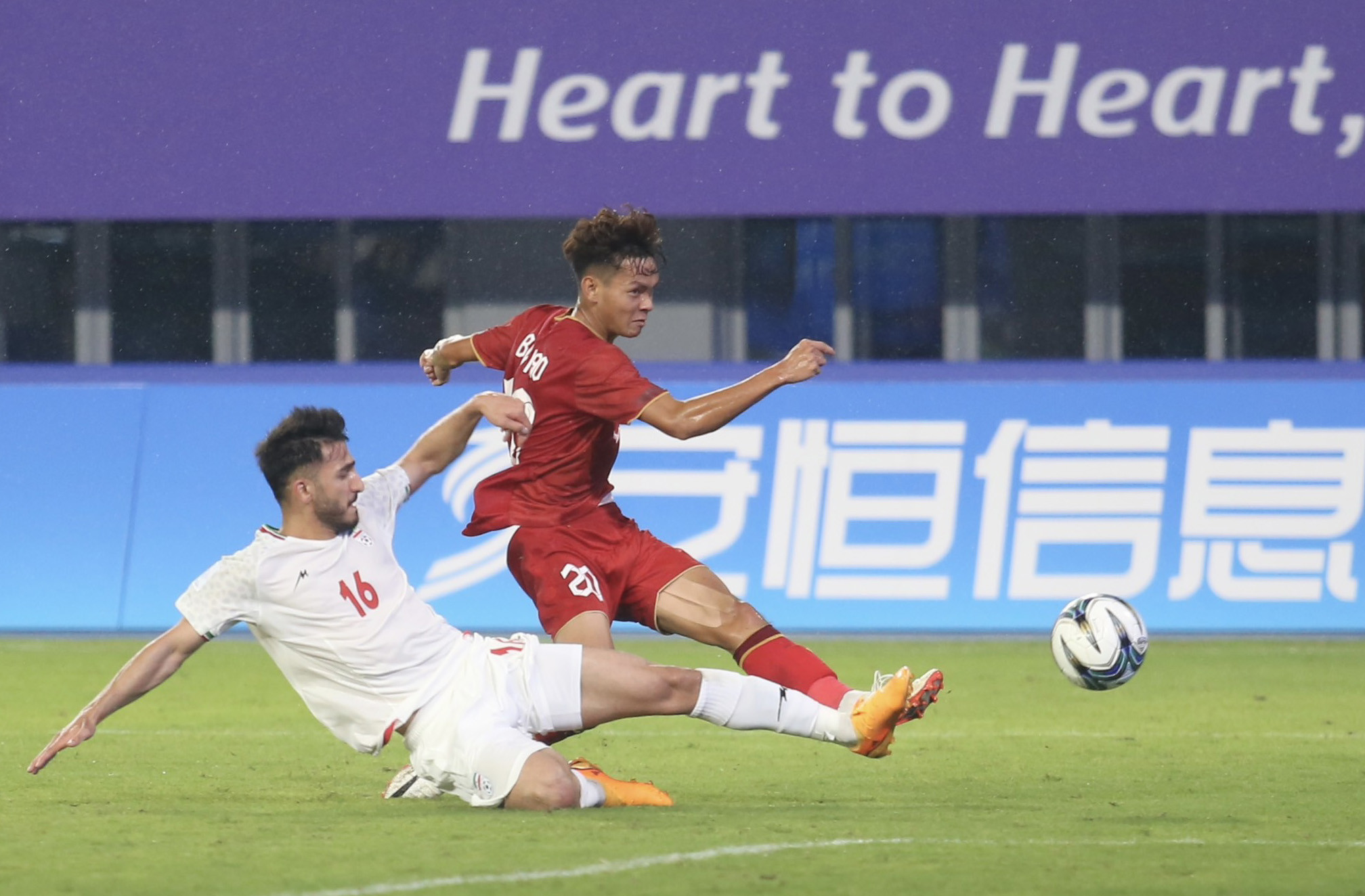 Vĩ Hào đột phá rồi quyết định dứt điểm nhưng không đánh bại được thủ môn Hosseini của Olympic Iran.
