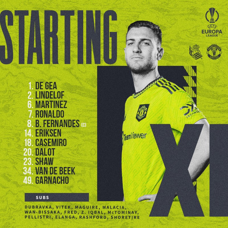 MU: De Gea; Dalot, Martinez, Lindelof (McTominay 58'), Shaw; Casemiro, Eriksen (Fred 82'); Van de Beek (Rashford 58'), Fernandes, Garnacho (Maguire 82'); Ronaldo.