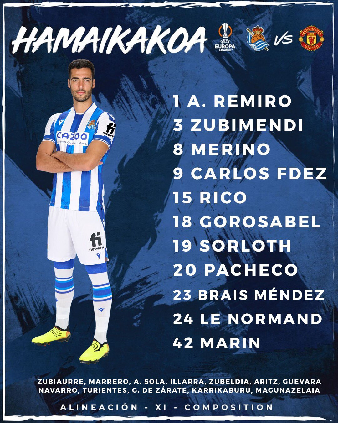 Real Sociedad: Remiro; Gorosabel, Pacheco, Rico; Merino, Zubimendi, Le Normand; Mendez; Marin, Sorloth, Fernandez