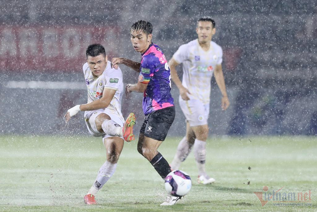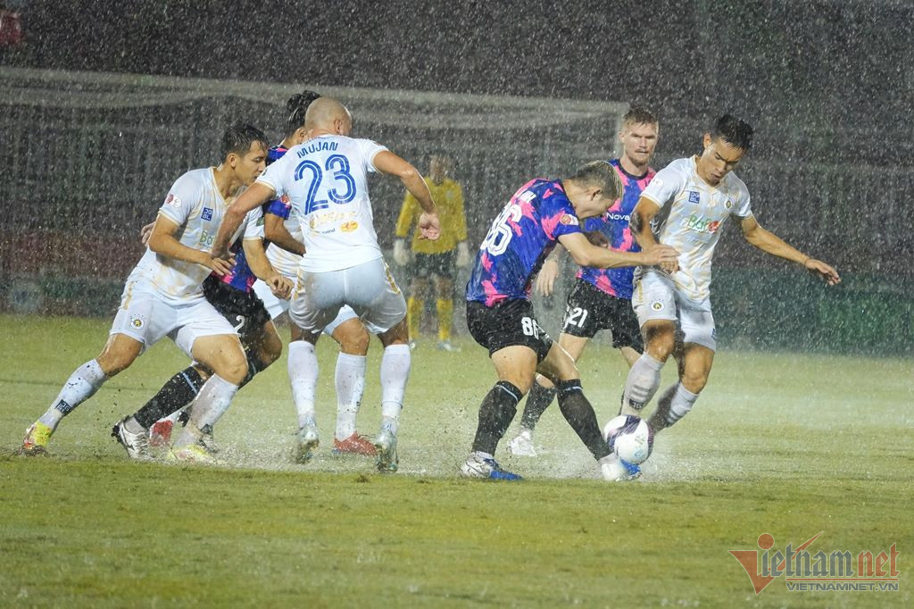 Cơn mưa nặng hạt trút xuống sân Thống Nhất ảnh hưởng đáng kể đến trận đấu.