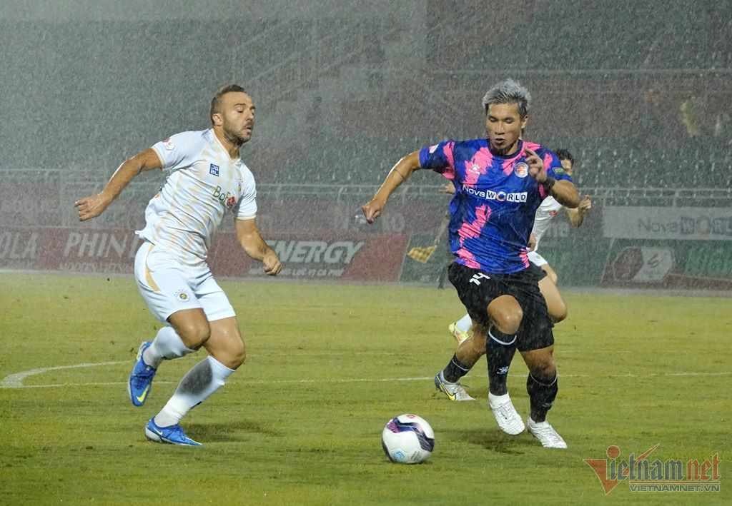 Văn Quyết tỉa bóng từ cánh trái vào vòng cấm cho Tuấn Hải, tiền đạo này lại bị ngã do sân trơn và để tay chạm bóng để lỡ cơ hội ngon ăn trước khung thành Sài Gòn.