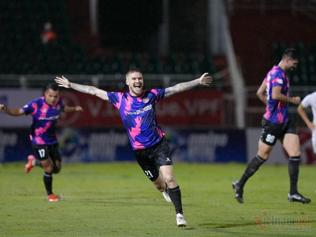 Đội trưởng Văn Quyết dứt điểm liên tiếp trong vòng cấm Sài Gòn để mang về bàn quân bình tỷ số 1-1 cho Hà Nội.