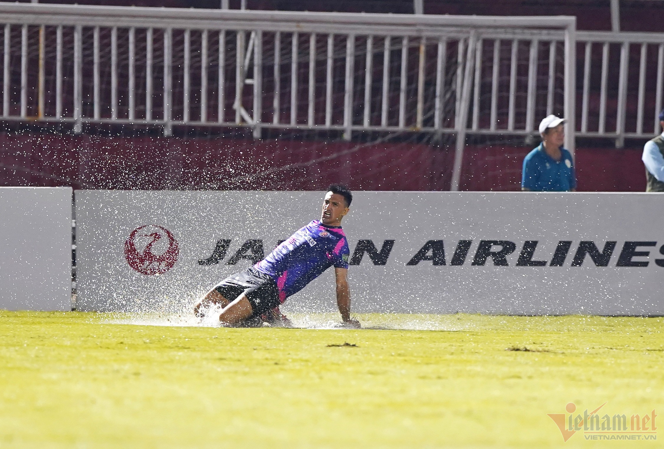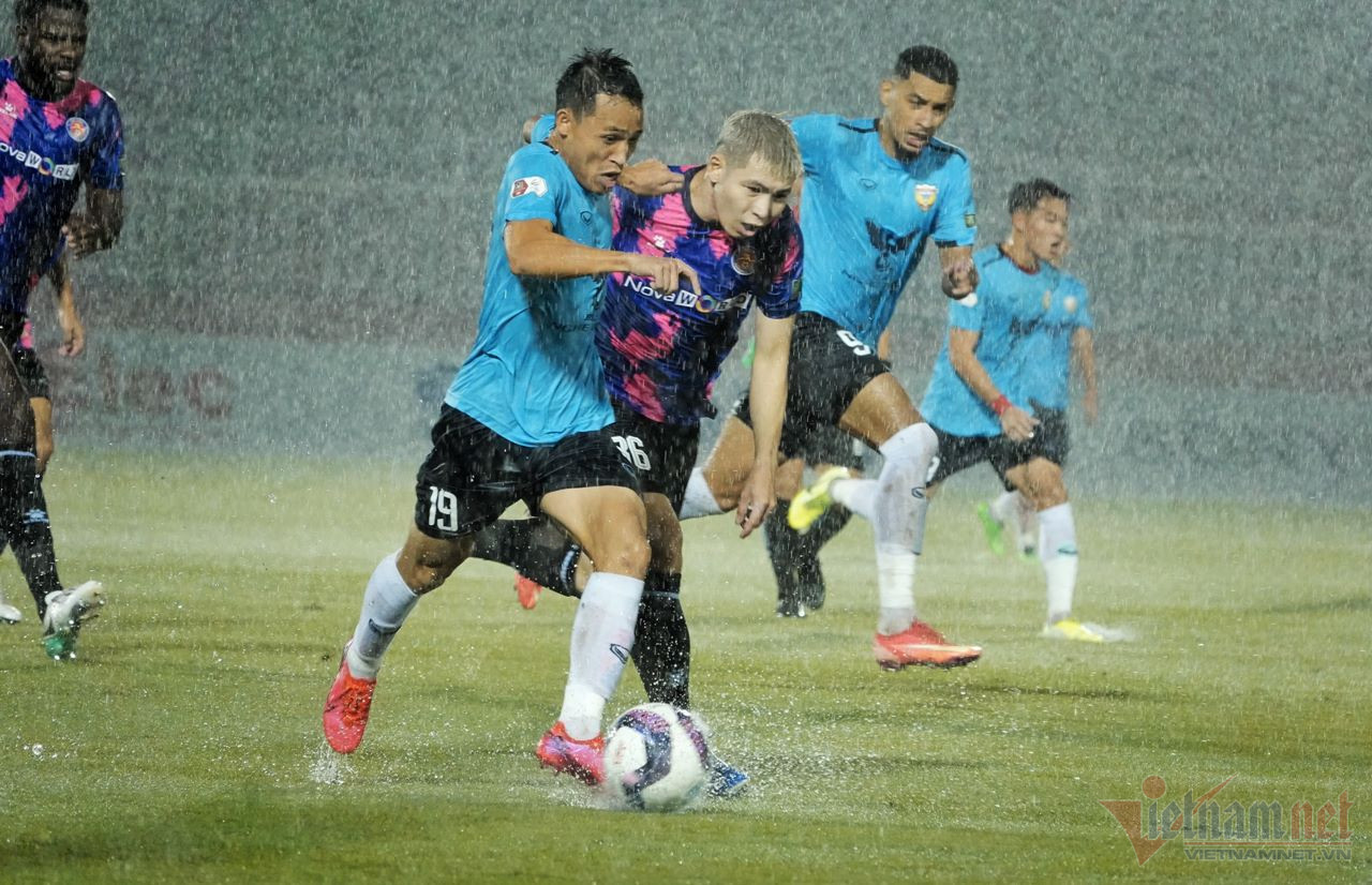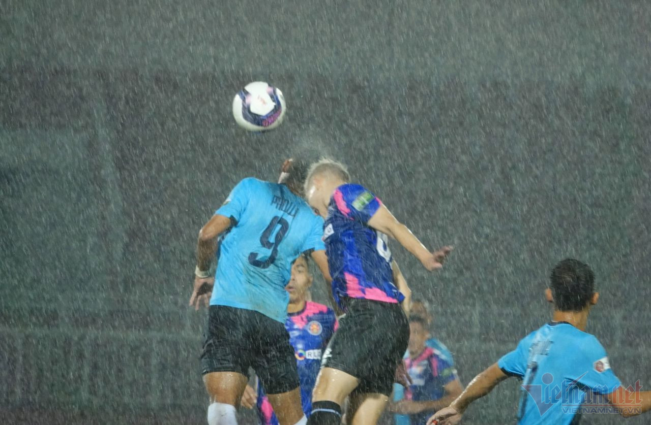 Cơn mưa nặng hạt khiến mặt sân Thống Nhất sũng nước, ảnh hưởng đáng kể đến lối chơi của hai đội.