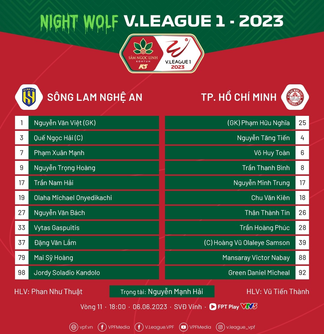 CLB TP.HCM: Hữu Nghĩa (25), Hoàng Phúc (28), Thành Tín (26), Tăng Tiến (4), Văn Kiên (18), Huy Toàn (6), Minh Trung (17), Thanh Bình (8), Daniel Green (92), Hoàng Vũ Samson (39), Mansaray (88).
