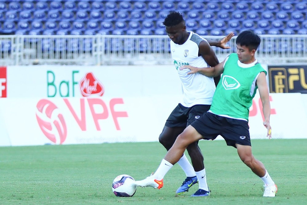 Phan Văn Đức xâm nhập vòng cấm, anh đón đường chọc khe tinh tế của Olaha trước khi cứa lòng nhưng bóng đi không khó đối với thủ môn Đình Triệu.