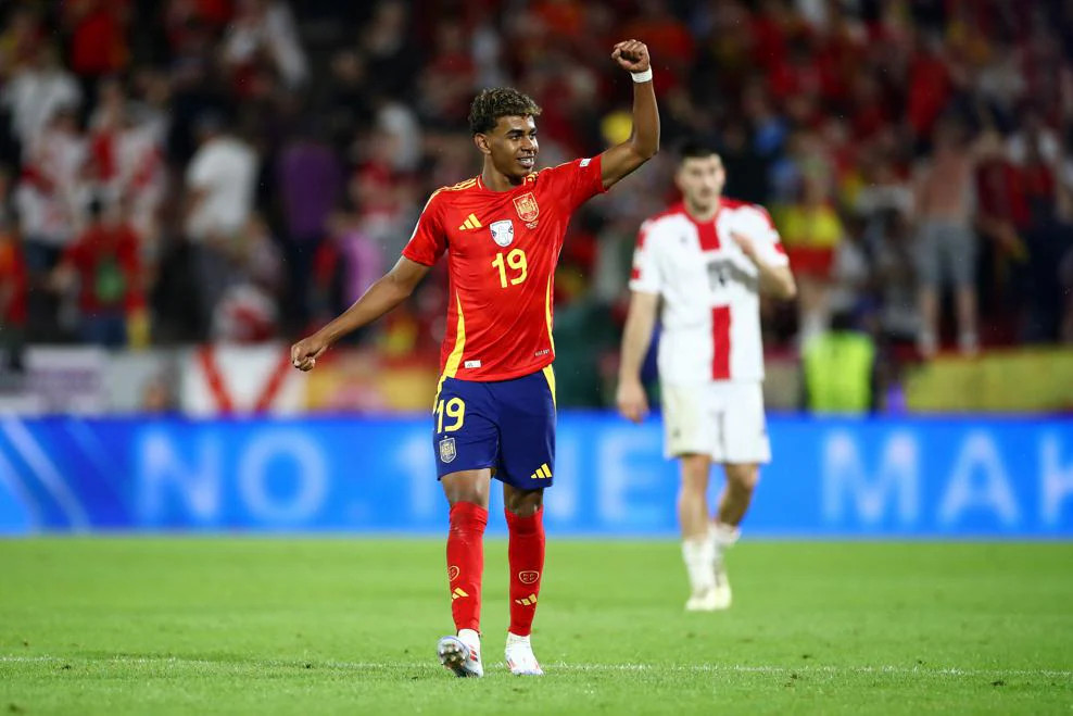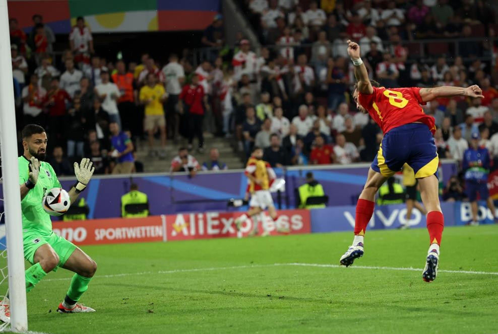 Yamal bật nhả với Dani Olmo trước khi căng ngang khiến hậu vệ Georgia đưa bóng về lưới nhà. Tuy nhiên trọng tài biên căng cờ báo việt vị đối với thần đồng 16 tuổi người Tây Ban Nha.