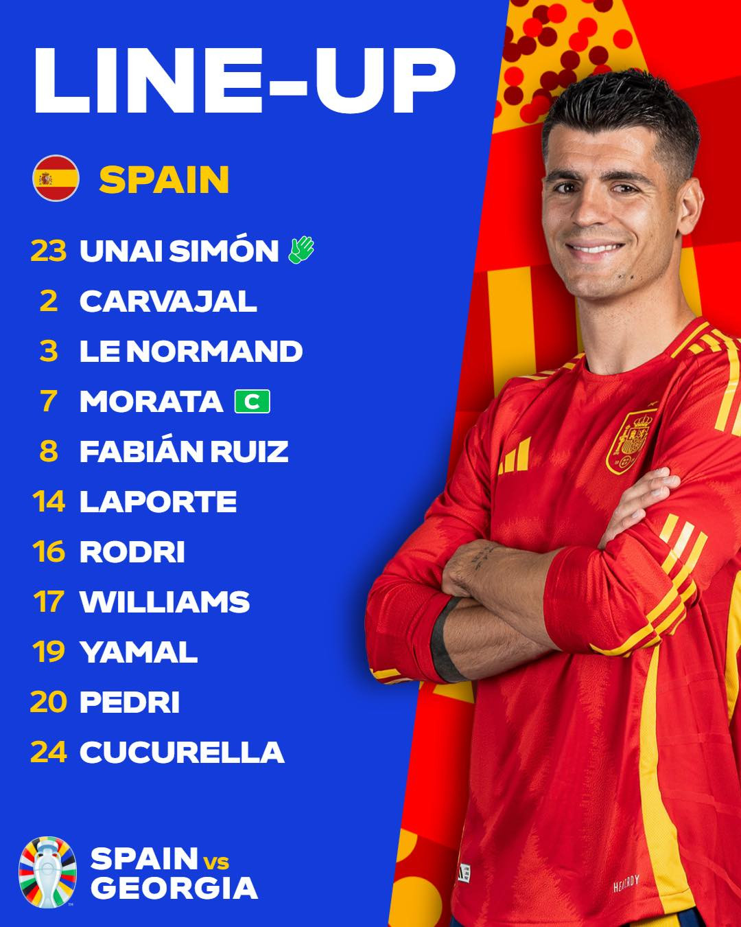 Tây Ban Nha: Simon, Carvajal, Laporte, Le Normand, Cucurella (Grimaldo 66'), Ruiz, Rodri, Pedri (Dani Olmo 52'), Morata (Oyarzabal 66'), Williams, Yamal