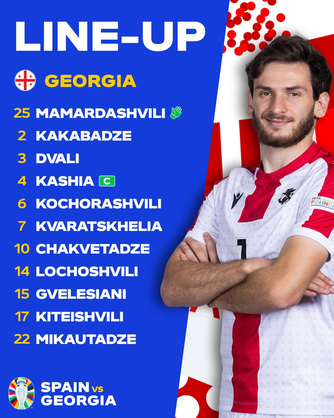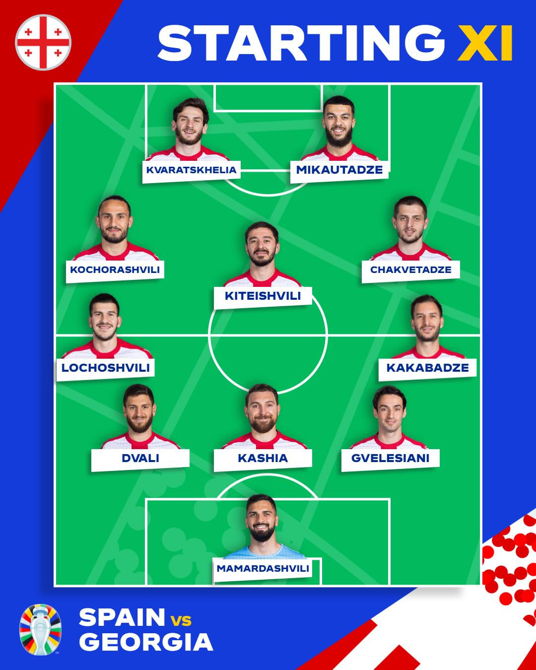 Georgia: Mamardashvili, Kashia, Gvelesiani, Kakabadze (Davitashvili 63'), Dvali, Lochoshvili (Tsitaishvili 63'), Kiteishvili (Altunashvili 41'), Kochorashvili, Chakvetadze, Kvaratskhelia, Mikautadze
