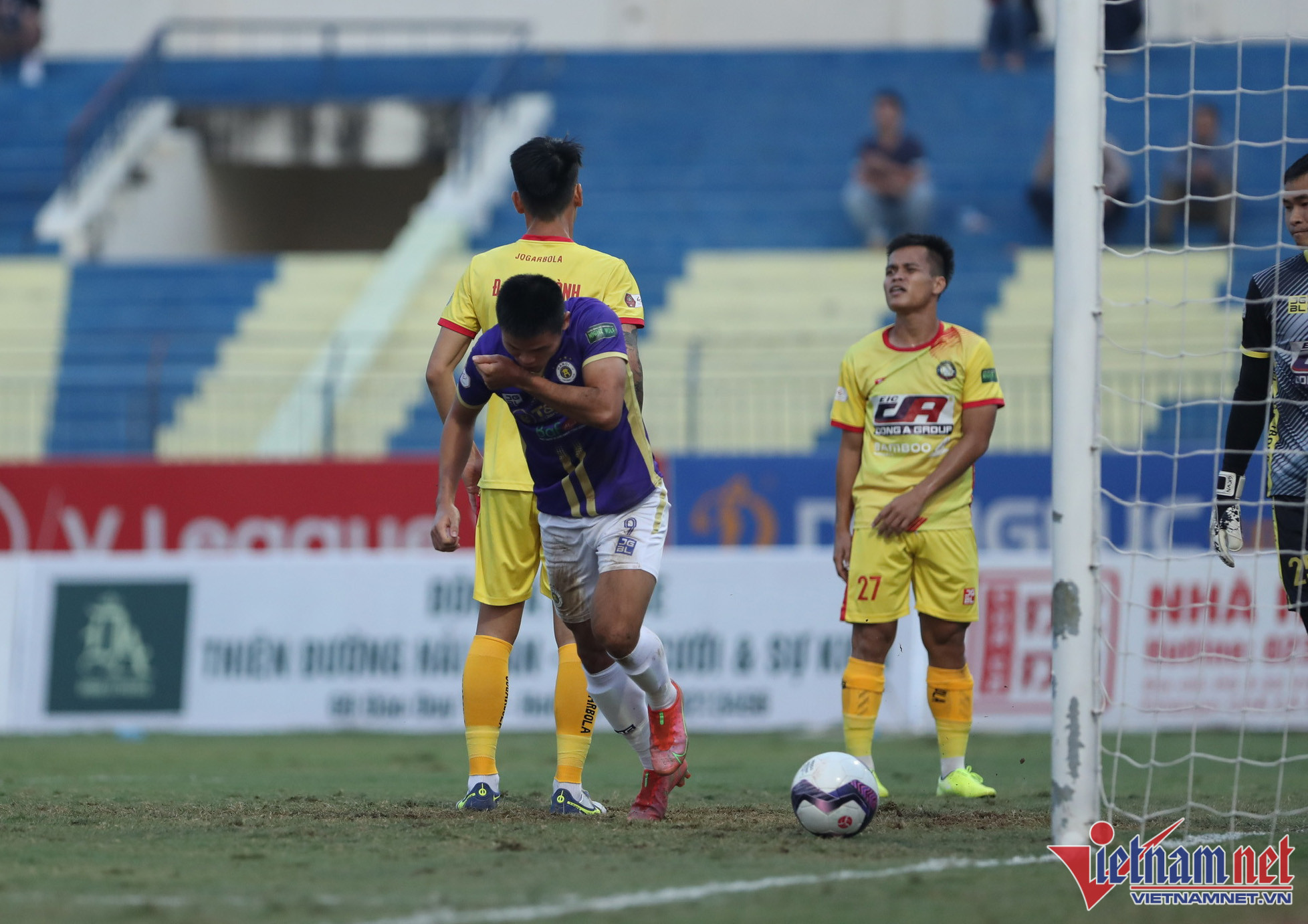 Không vào! Hà Nội phản công, Tuấn Hải bị đau sau pha va chạm với A Mít, khiến cú sút không đủ lực. Bóng bật ra được Hùng Dũng treo hiểm hóc, nhưng Hai Long đánh đầu cận thành đi ra ngoài.