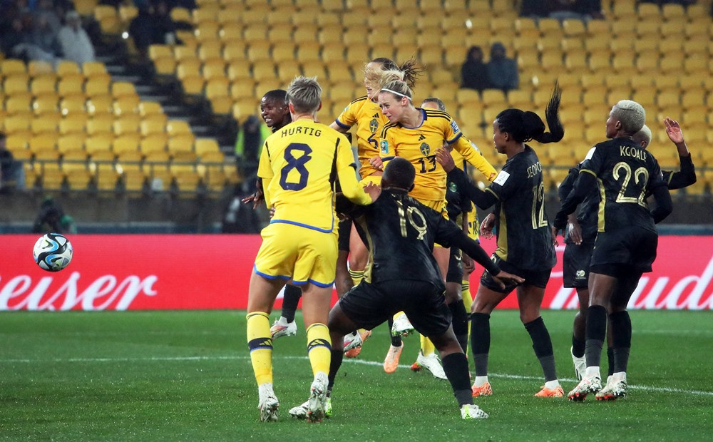 Từ quả căng ngang của Filippa Angeldal bên cánh phải Thụy Điển, Lebogang Ramalepe của nữ Nam Phi trong nỗ lực phá bóng trước sức ép của Fridolina Rolfo, vô tình làm tung lưới nhà.