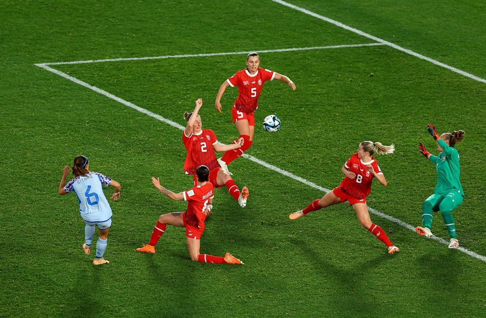 Thủ quân Esther Gonzalez xử lý đầu khéo léo trong vòng cấm Thụy Sỹ, tiếc cho cô khi cú sút cận thành bị hậu vệ đối phương dùng lưng cản phá.