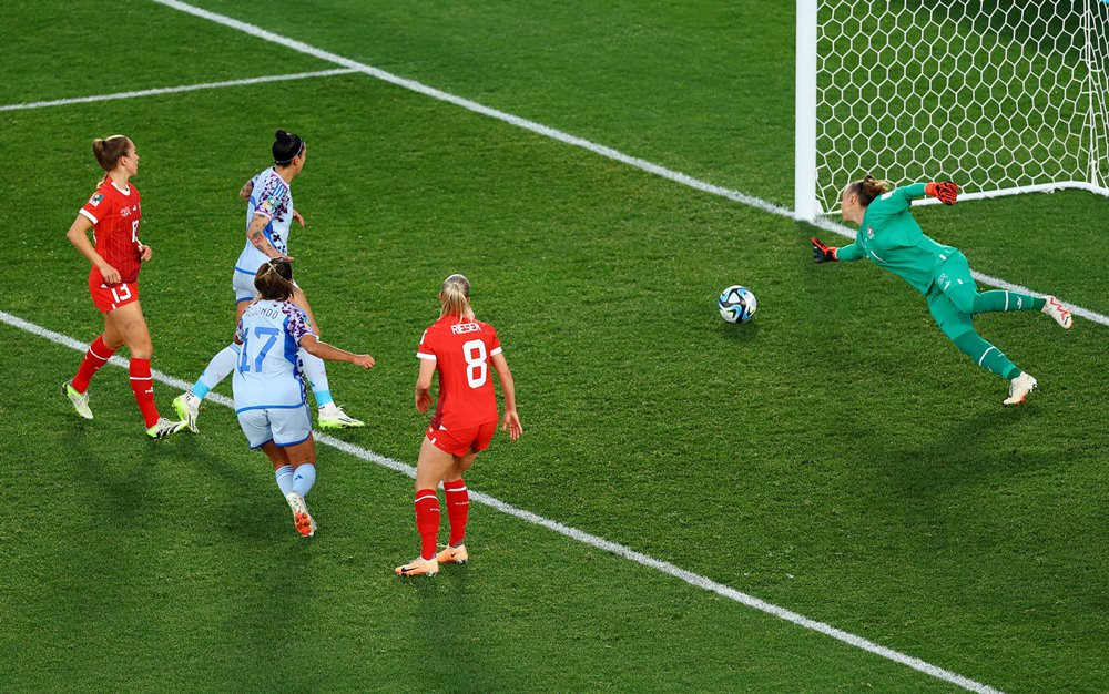 Trung vệ Laia Codina Panedas chớp thời cơ, trong vòng vây của 4 cầu thủ Thụy Sỹ nhưng cô vẫn nhanh chân sút tung lưới đội phương. Cô ăn mừng đầy cảm xúc sau pha lập công chuộc tội.