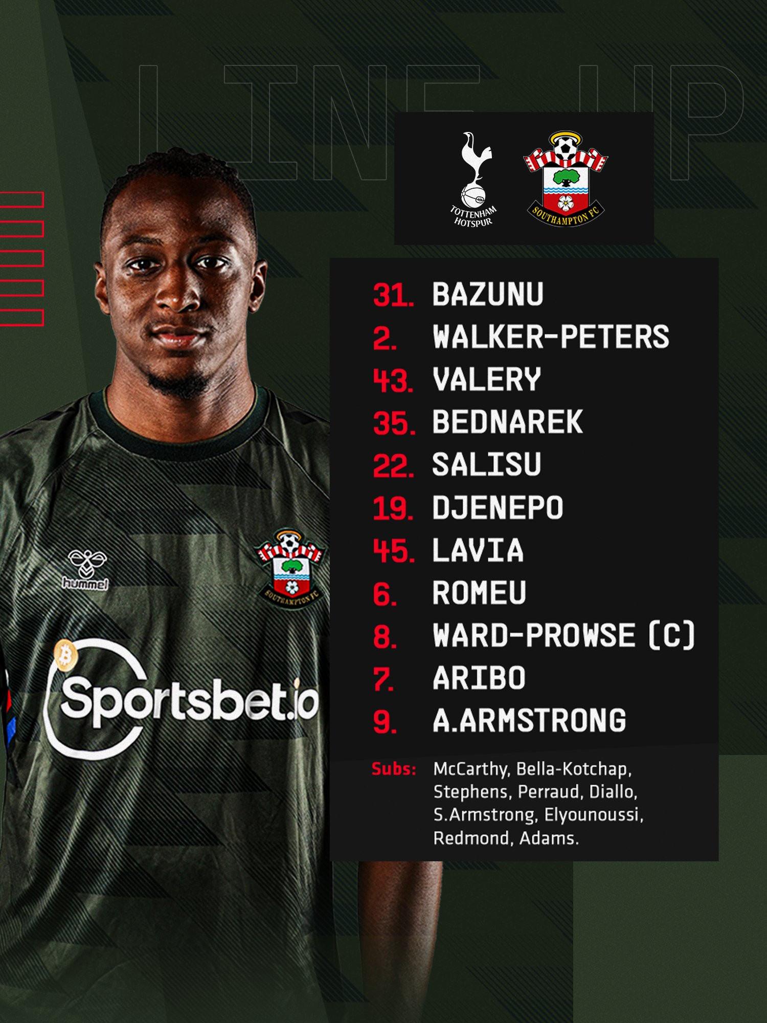 Southampton: Bazunu, Walker-Peters, Salisu, Bednarek, Valery, Ward-Prowse, Romeu, Djenepo, Lavia, Aribo, A.Amstrong.