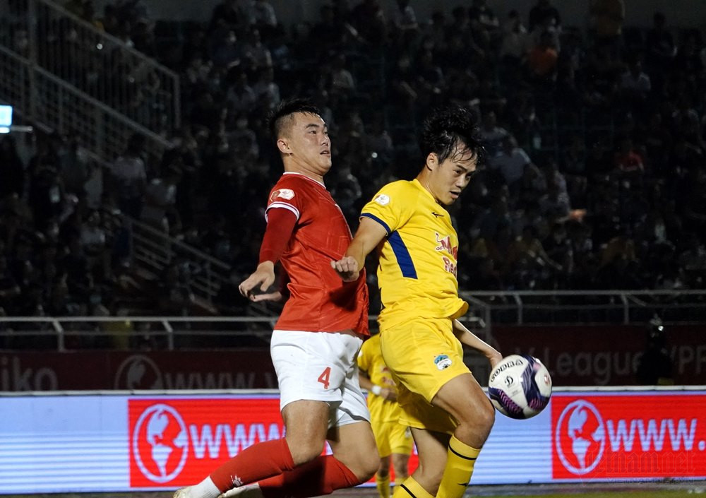 Văn Toàn đột phá xuốn đáy biên rồi tạt bổng vô tình đưa bóng dội xà ngang khung thành đội chủ nhà TP.HCM.