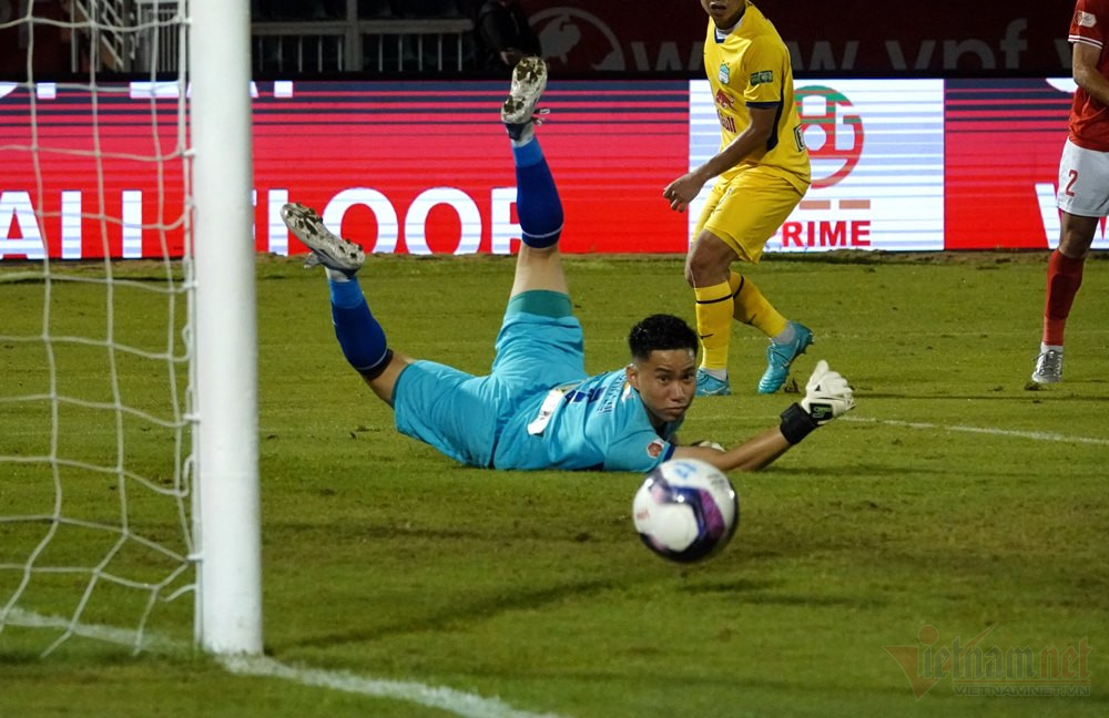 Hậu vệ quê Hải Dương tạt bóng nửa dứt điểm đưa bóng vượt qua tầm với của thủ môn Bùi Tiến Dũng. May cho TP.HCM khi bóng dội xà ngang trước khi đi hết đường biên ngang.