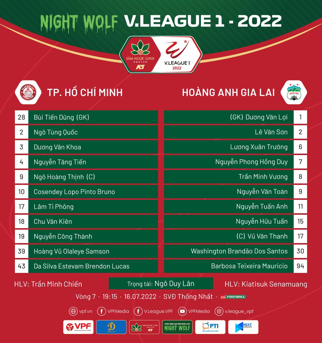 TP.HCM: Tiến Dũng (thủ môn), Brendon Lucas, Văn Khoa, Tăng Tiến, Tùng Quốc, Hoàng Thịnh, Ti Phông, Bruno Cosendey, Văn Kiên, Công Thành, Hoàng Vũ Samson.