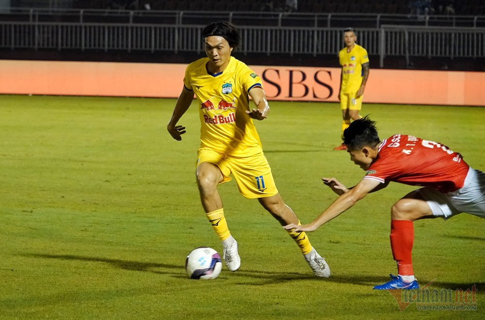 Tiền vệ quê Thái Bình đột phá dũng mạnh, anh xử lý khéo léo trước khi tung cú sút trong vòng cấm đưa bóng đi chệch khung thành TP.HCM chỉ gang tấc.