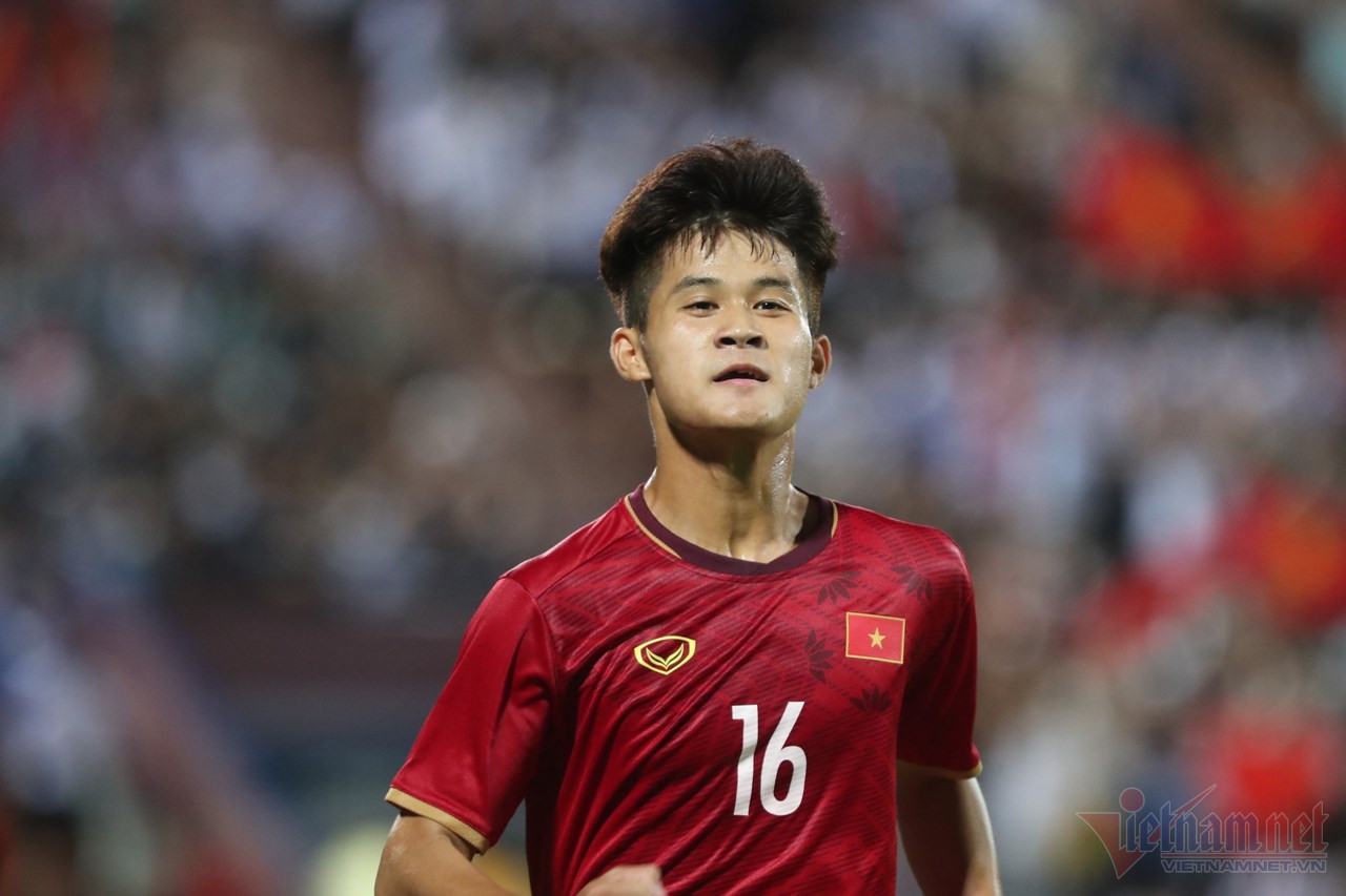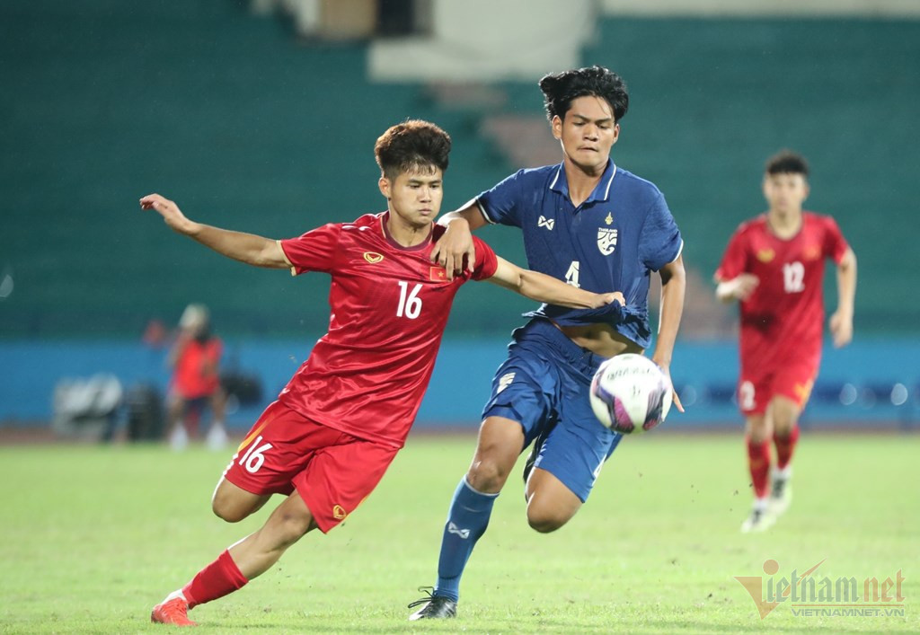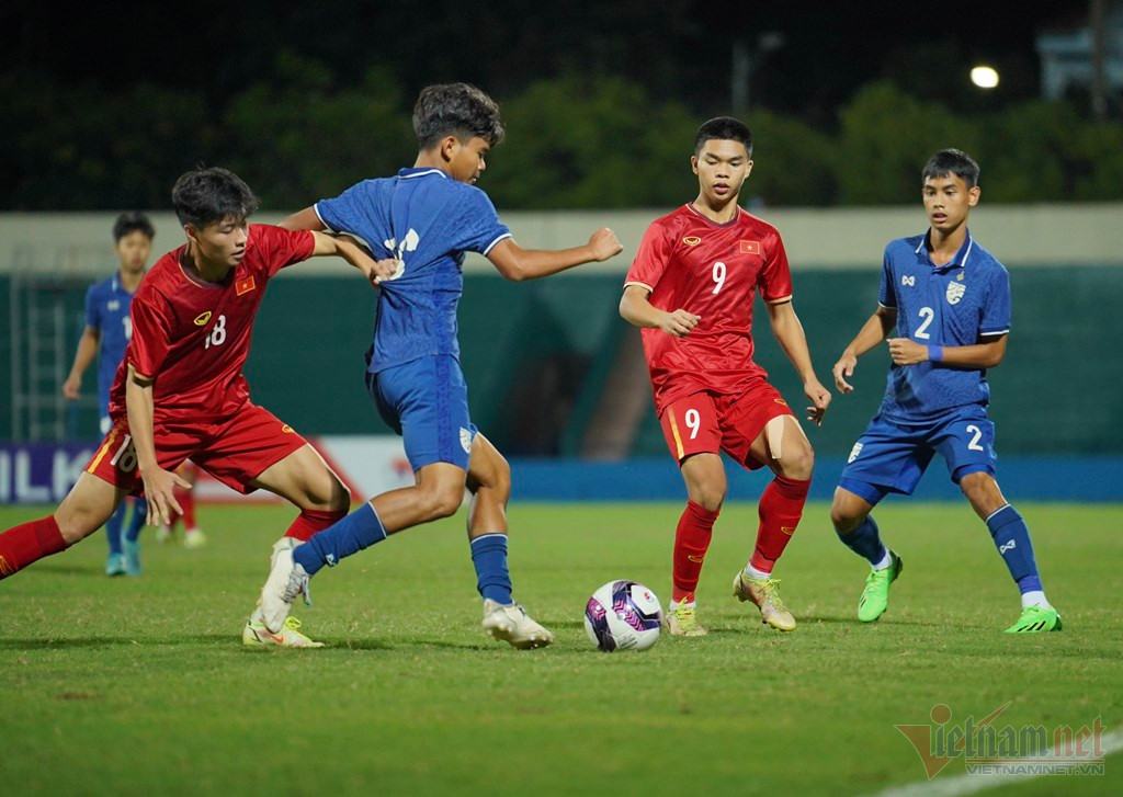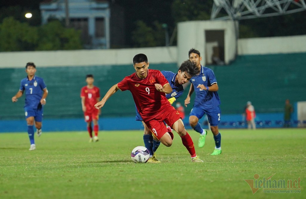 Hoàng Sơn vượt qua cầu thủ U17 Thái Lan trước khi xâm nhập vòng cấm. Đáng tiếc khi pha trả bóng ra lại không đến được vị trí của đồng đội.