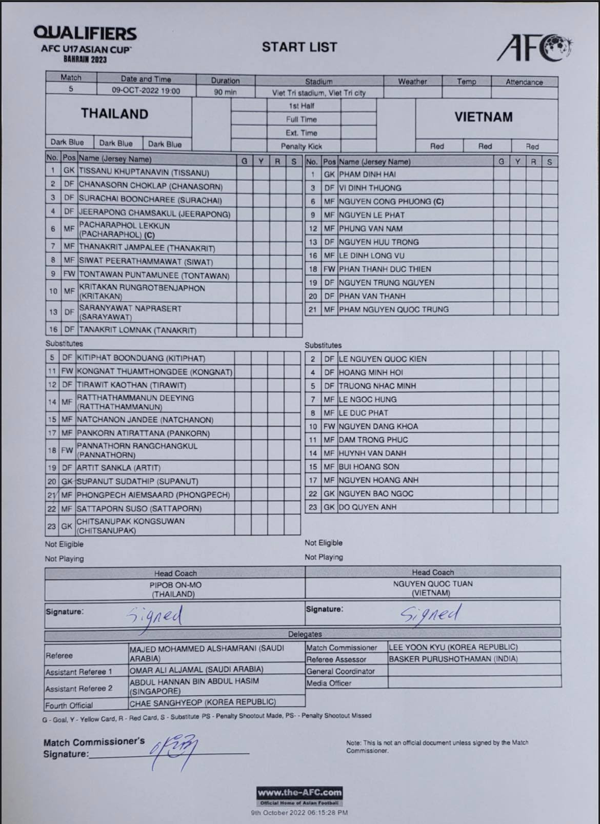 U17 Thái Lan: 1. Dharissanu Guptanawin (GK) 2. Chonsorn Fortune 3. Surachai Booncharee 4. Jirapong Chaemsakul 6. Patcharaphon Lekkul (C) 7. Thanakrit Champali 8. Siwat Pirathamwat 9. Tontawan Puntamuni 10. Krittakarn Rungrojbenjapol 13. Saranyawat Namprasert 16. Thanakrit Lomnak
