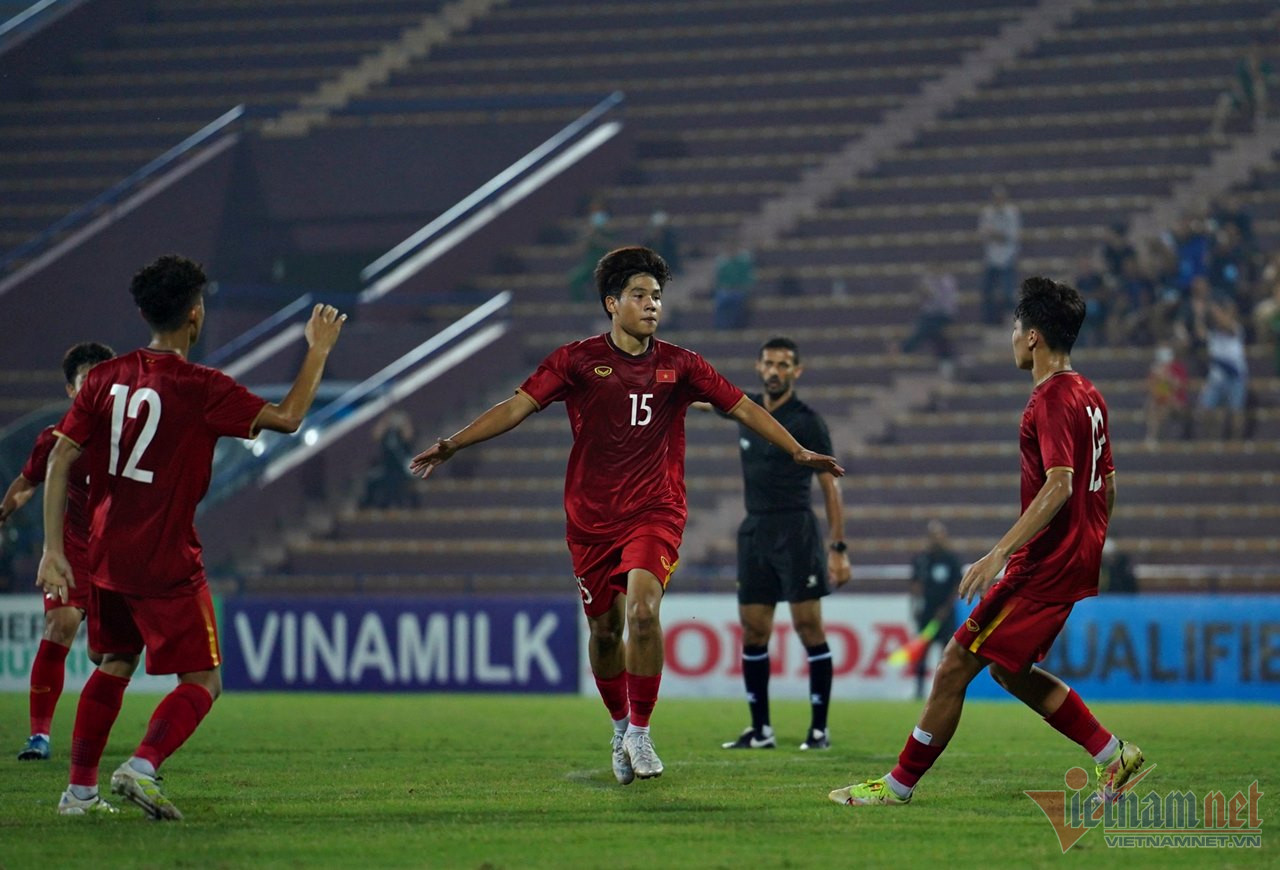 BÀN THẮNG! U17 Việt Nam 3-0 U17 Đài Bắc Trung Hoa (Hoàng Anh): Long Vũ tạt bóng chìm thuận lợi để Hoàng Anh băng vào đệm bóng cận thành đưa bóng chạm chân cầu thủ đối phương rồi lăn vào lưới.