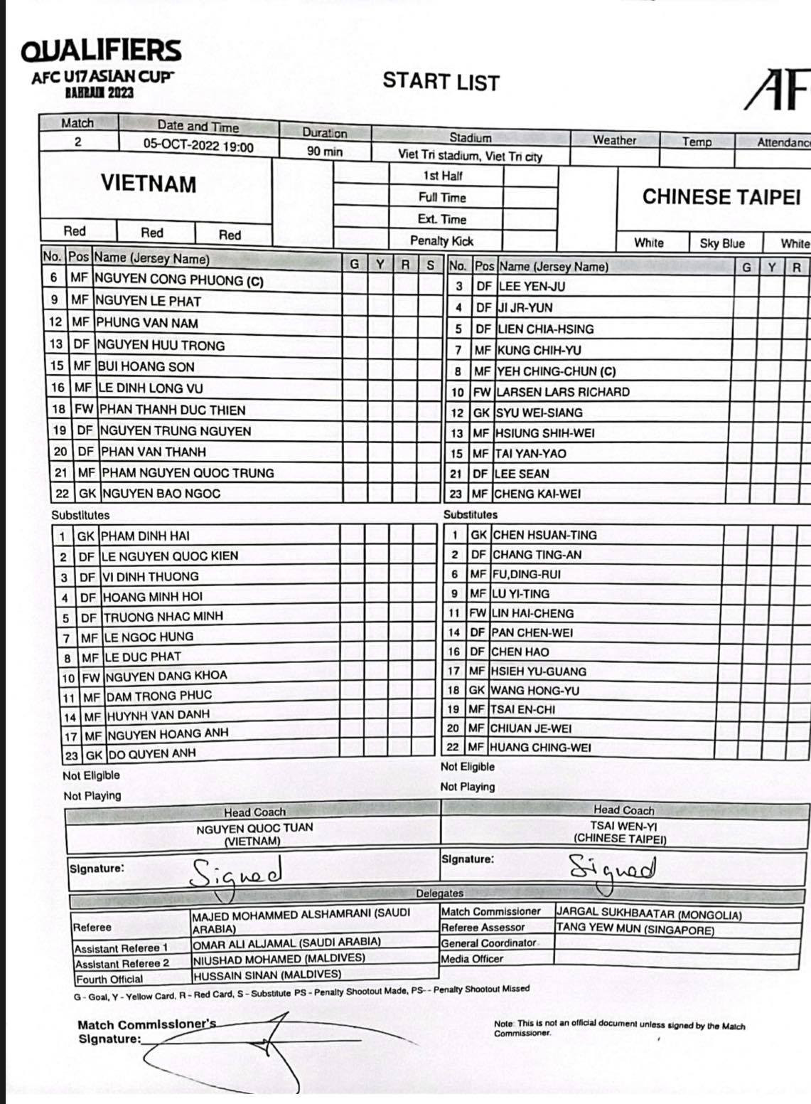 U17 Đài Bắc Trung Hoa: Syu Wei Siang, Lee Yen Ju, Ji Jr Yun, Lien Chia Hsing, Lee Sean, Kung Chih Yu, Yeh Ching Chun (Hsieh Yu Guang 85’), Hsiung Shih Wei (85’), Tai Yan Yao, Cheng Kai Wei (Tsai En Chi 51’), Larsen Richard (Lu Yi Ting 51’).