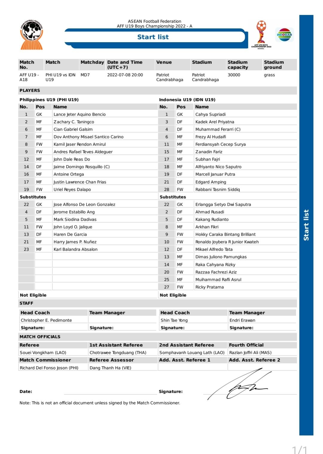 U19 Indonesia: Cahya Supriadi, Kakang Rudianto, Achmad Rusadi, Dimas Juliono, Marcell Januar, Mikael Tata, Arkhan Fikri, Marselino Ferdinan, Subhan Fajri, Siddiq, Amping.