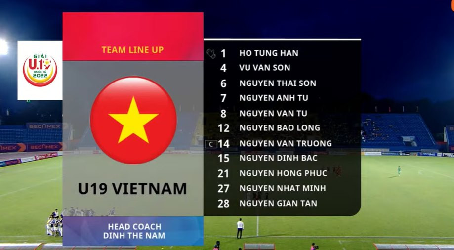 U19 Việt Nam: 1 - Hồ Tùng Hân, 4 - Vũ Văn Sơn, 6 - Nguyễn Thái Sơn, 7 - Nguyễn Anh Tú (Văn Thao 75'), 8 - Nguyễn Văn Tú (Thanh An 75'), 12 - Nguyễn Bảo Long, 14 - Nguyễn Văn Trường (Quốc Việt 53'), 15 - Nguyễn Đình Bắc, 21 - Nguyễn Hồng Phúc, 27 - Nguyễn Nhật Minh , 28 - Nguyễn Giản Tân
