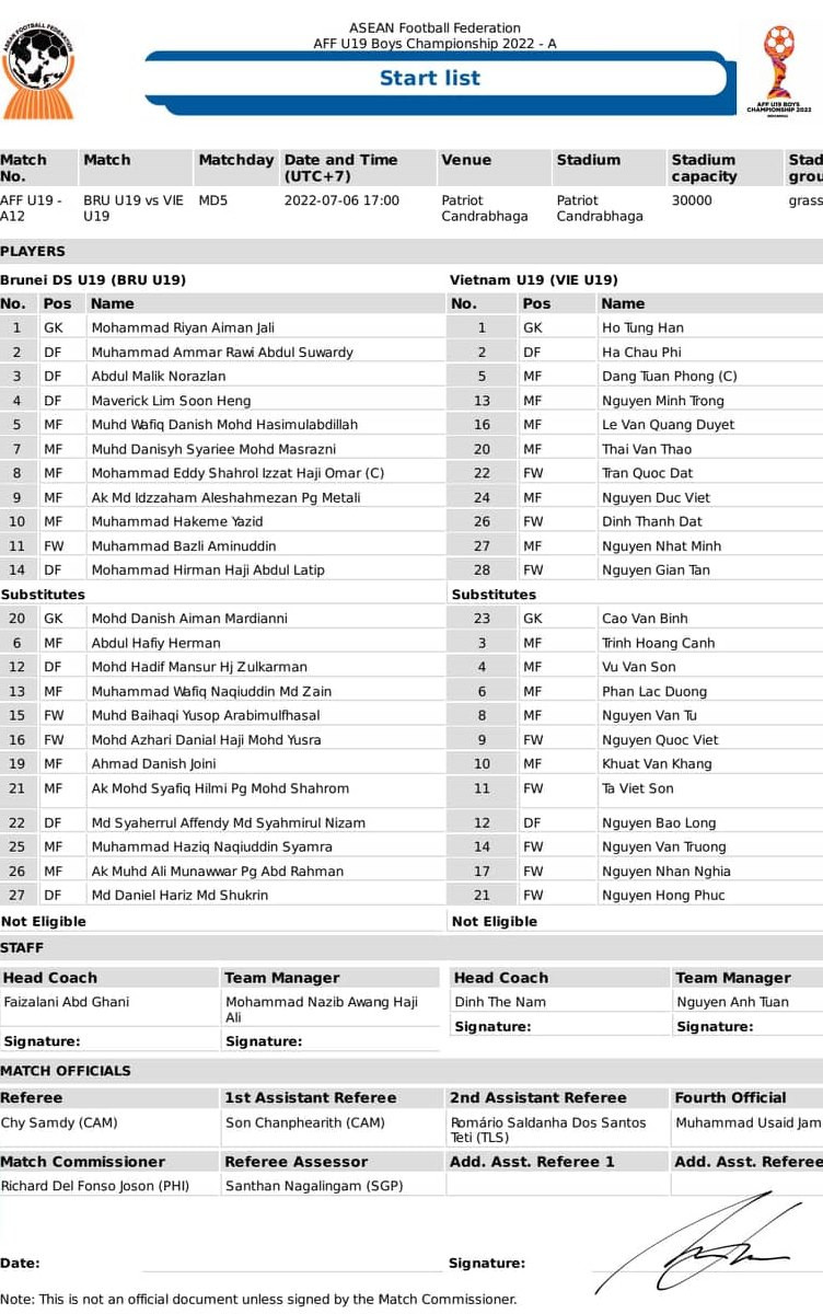 U19 Việt Nam: Tùng Hân, Nhật Minh, Tuấn Phong, Châu Phi, Thành Đạt, Đức Việt (Quốc Việt 63'), Quang Duyệt (Văn Tú 63'), Minh Trọng (Văn Bình 80'), Quốc Đạt, Văn Thảo, Giản Tân.