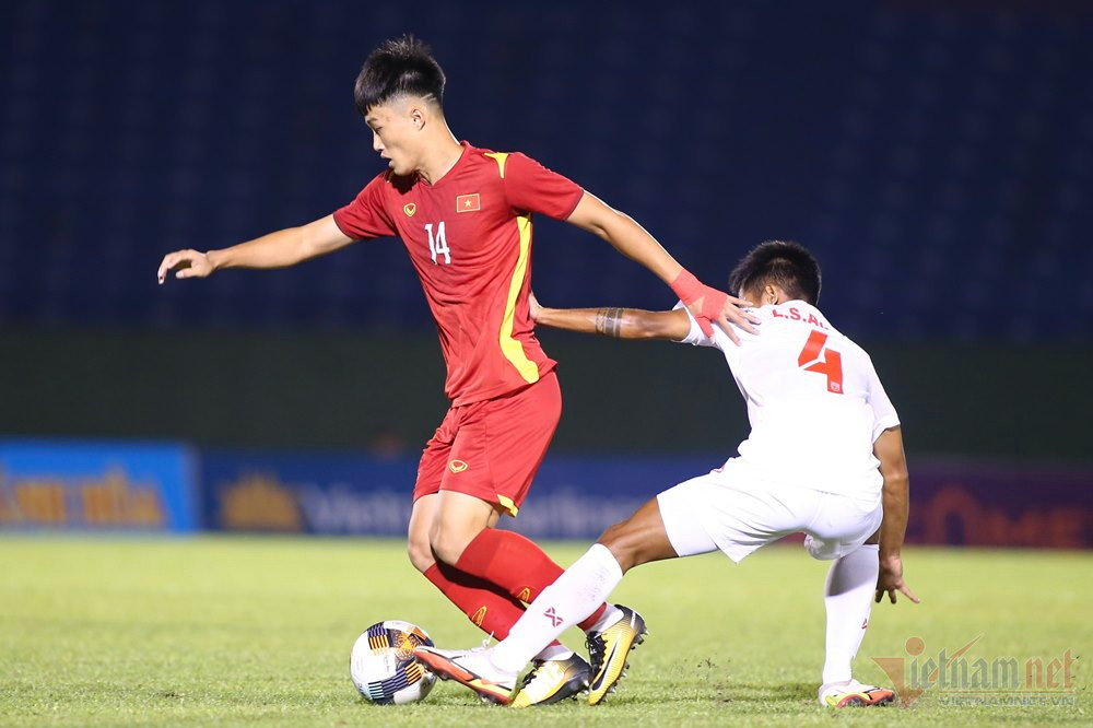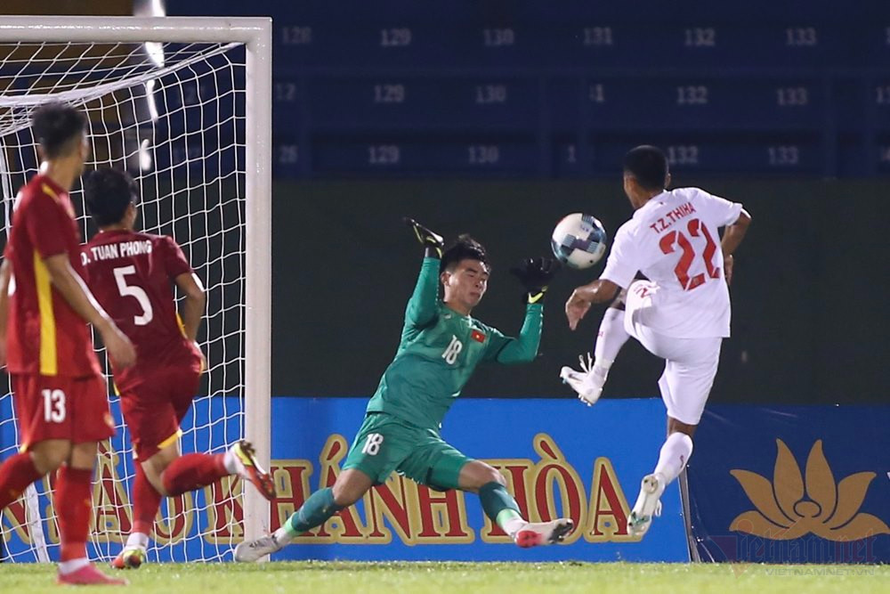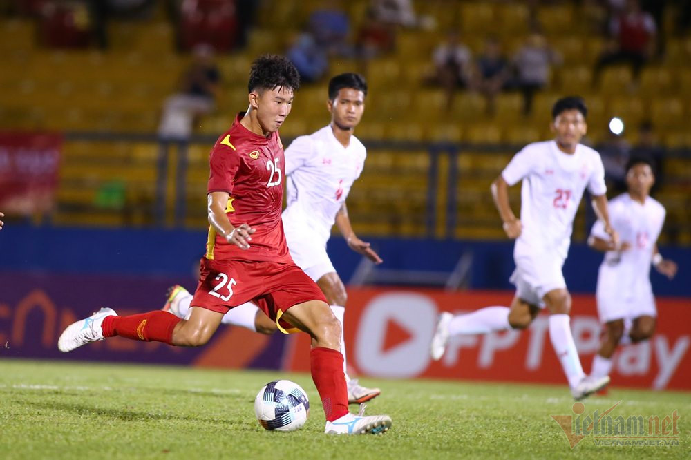 Văn Khang đi bóng nỗ lực bên cánh phải trước khi căng ngang để Văn Trường băng vào đánh đầu làm rung mép lưới bên ngoài khung thành U19 Myanmar.