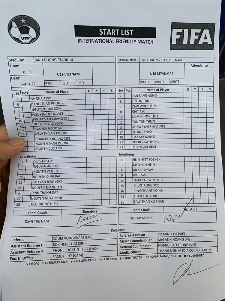 U19 Việt Nam: Huy Hoàng, Đức Anh, Tuấn Phong, Hà Châu Phi, Bảo Long, Thái Sơn, Văn Khang, Văn Trường, Ngọc Mỹ, Đăng Dương, Quốc Việt.