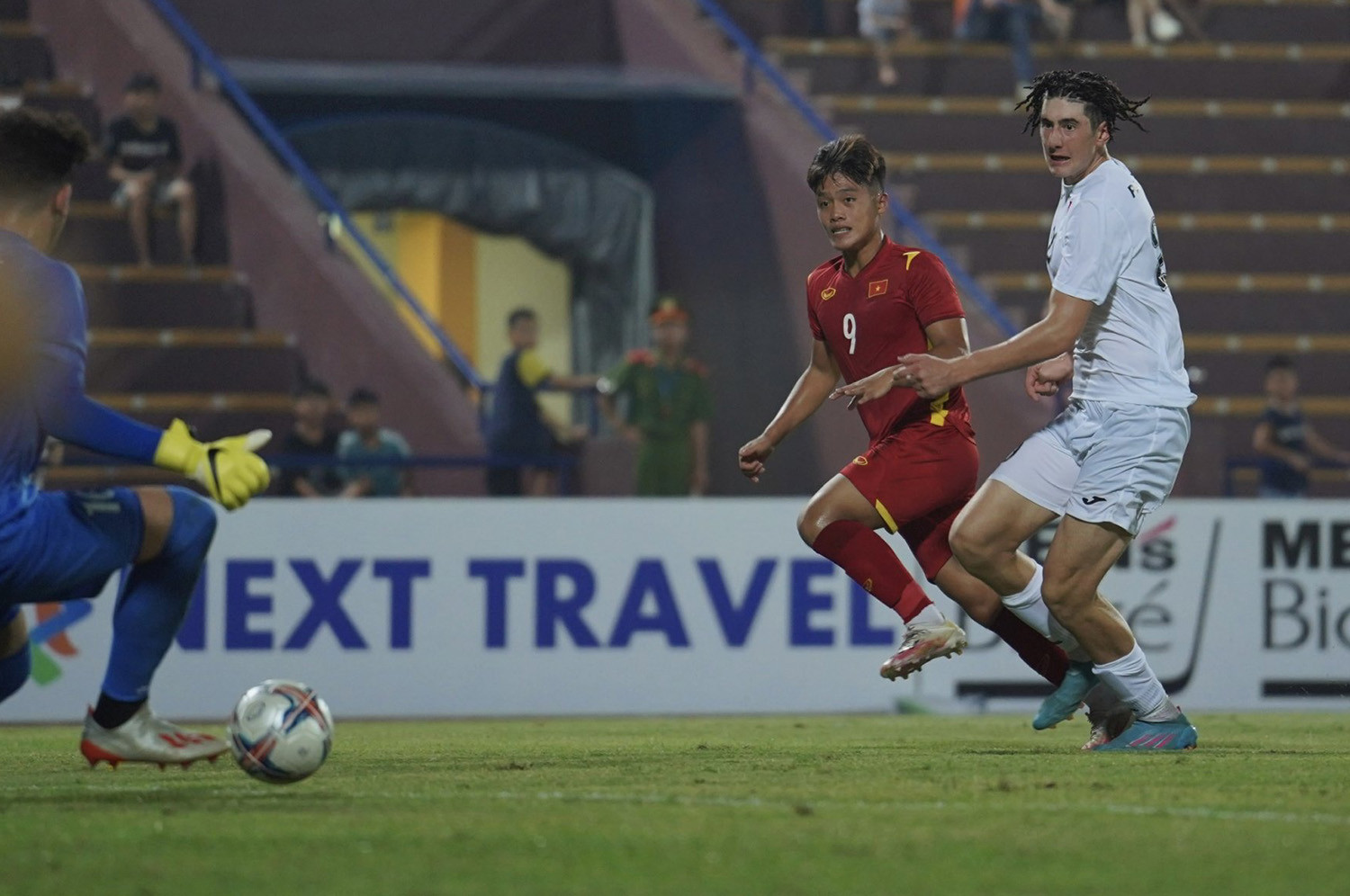 Không vào! Quốc Việt vẫn chưa có bàn thắng cho mình. Số 9 của U20 Việt Nam khống chế bóng gọn gàng rồi tung cú sút chệch cột dọc chỉ vài cm.