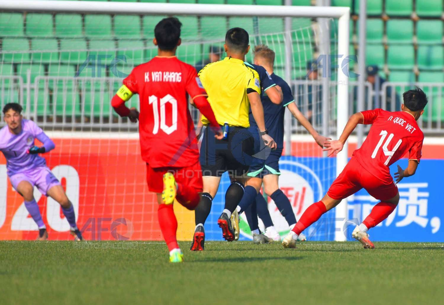 Xuất phát từ pha phản công nhanh của U20 Việt Nam, Quốc Việt dẫn bóng đến trước vòng cấm U20 Australia rồi tung cú sút tuyệt đẹp đánh bại thủ môn Jack Warshawsky mở tỉ số cho đội bóng áo đỏ.