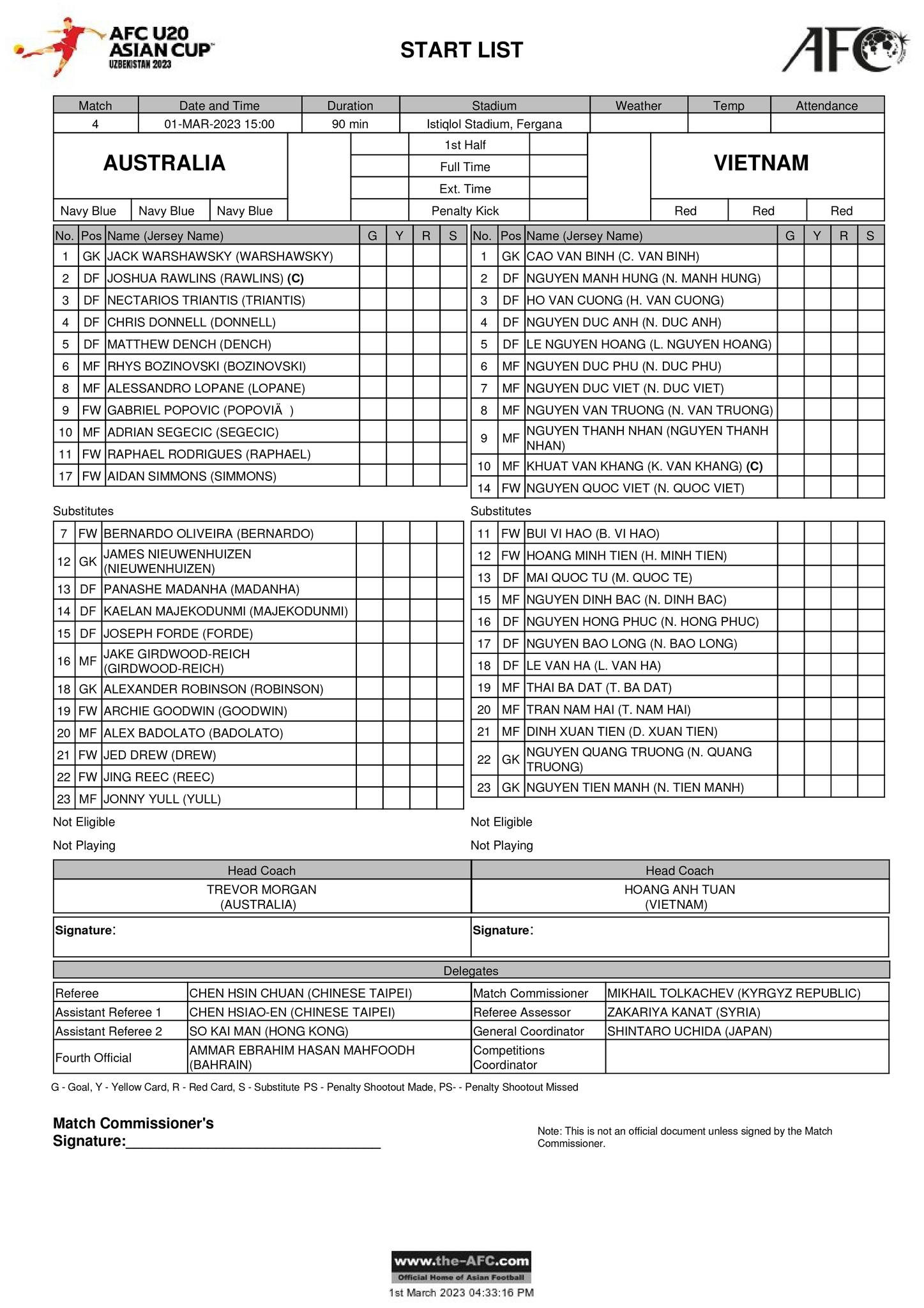 Đội hình ra sân U20 Việt Nam vs U20 Australia
